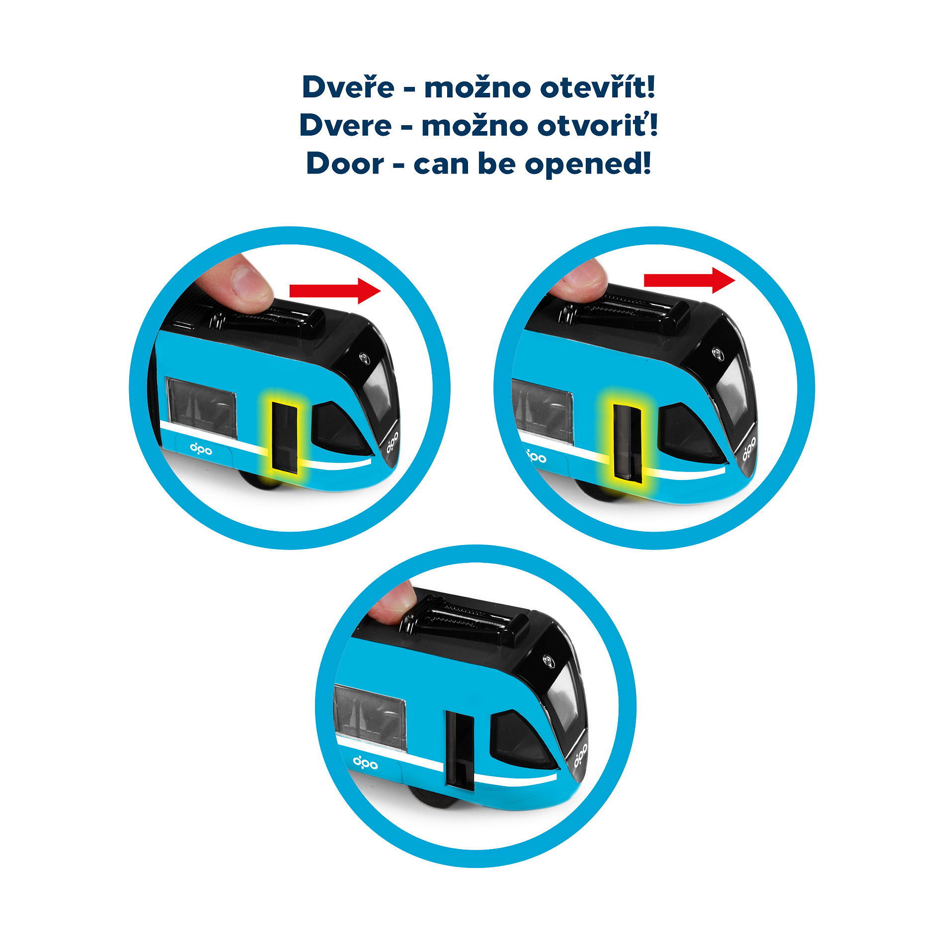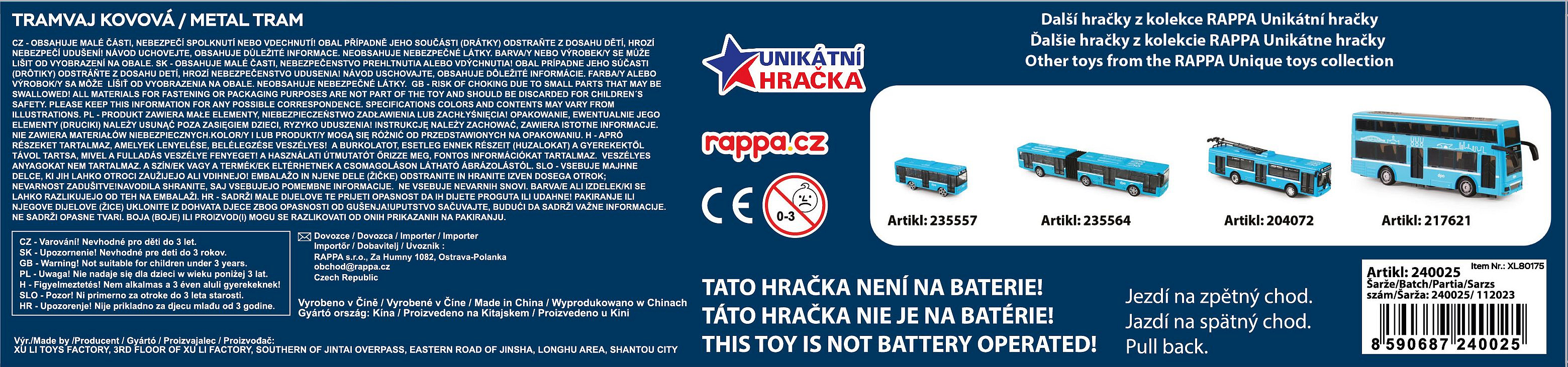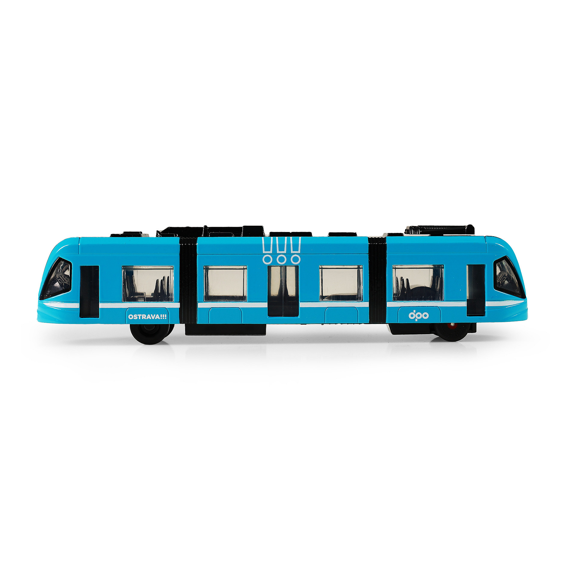 Moderní tramvaj v modré barvě, která jezdí na zpětný chod je perfektním dárkem pro všechny tramvajové nadšence. Dveře na jedné straně vozu lze manuálně otevřít a zavřít pomocí pantografu na střeše vozu. Tramvaj je vyrobená z kovu, je dlouhá 23 cm a je velmi podobná tramvaji, která jezdí ulicemi v Ostravě. Tato hračka byla vyrobena ve spolupráci s Dopravním podnikem města Ostravy a městem OSTRAVA!!!