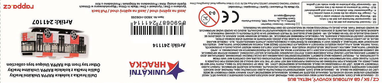 Moderní kovový autobus v červeném provedení je unikátní hračkou, která nadchne všechny malé i velké fanoušky dopravních prostředků. Autobus je dlouhý cca 18 cm, jezdí na zpětný chod a je velmi podobný tomu, který jezdí ulicemi v Praze. Tato hračka byla vyrobena ve spolupráci s Dopravním podnikem hlavního města Prahy.