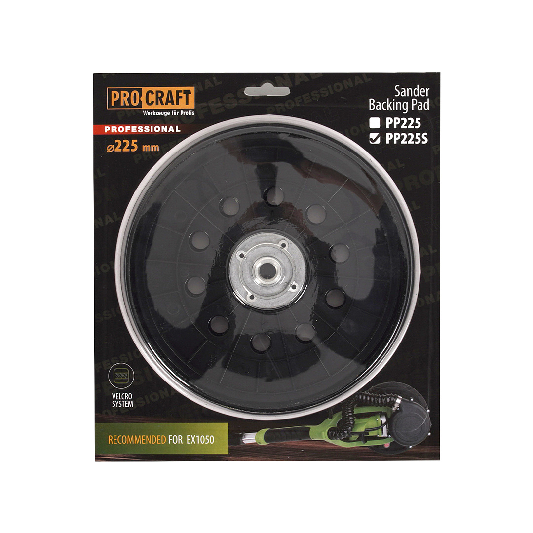 Kulatý unášecí talír Procraft PP225S pro brusky na sádrokarton, průměr 225 mm, se suchým zipem a závitem M14. Otvory pro odsávání zlepšují práci, vhodný pro EX1050.