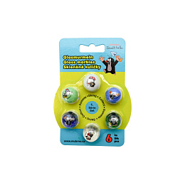 Zahrajte si s dětmi venku kuličky a nasbírejte všechny barvy i obrázky! Skleněné kuličky s obrázkem Krtka mají pr.25mm, balené na blistru, 8 různých motivů grafiky, 6 barev skla (3× čiré + 3× matné).