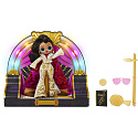 V sadě - módní panenka, 2 módní outfity, 1 pár bot, krabice na boty, doplňky, krabice, kartáč na vlasy, pytle na oblečení, stojan na panenky, gramofonová deska, textový magazín a gramofonový balíček, který přehrává hudbu.