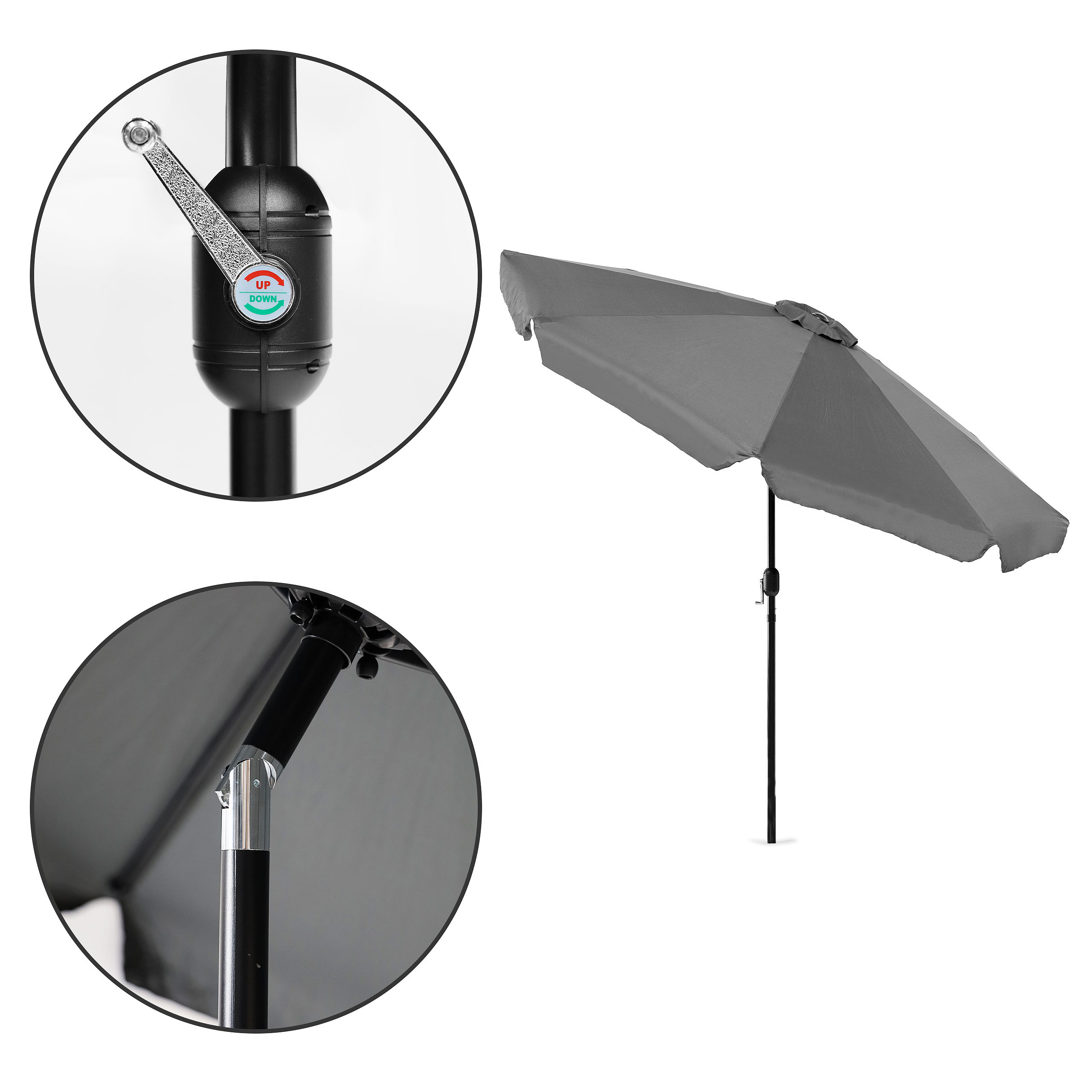 A special handle helps you open the parasol. Just a few turns of the crank and the canopy will automatically unfold and tighten evenly. Thanks to this practical solution you can quickly fold the parasol when the weather changes.