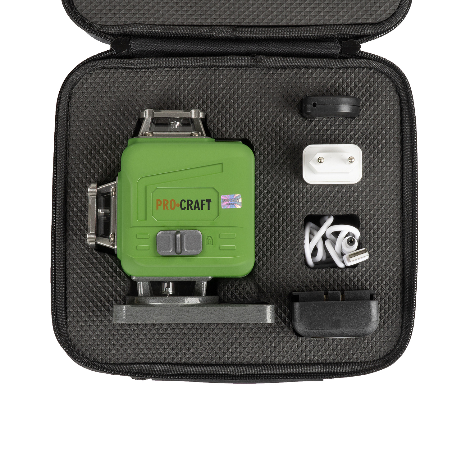 Laser zelený liniový, křížový samonivelační Procraft LE-4GL Součástí balení: akumulátor, ochranné pouzdro, napájecí adaptér, úhel vyzařování 360°