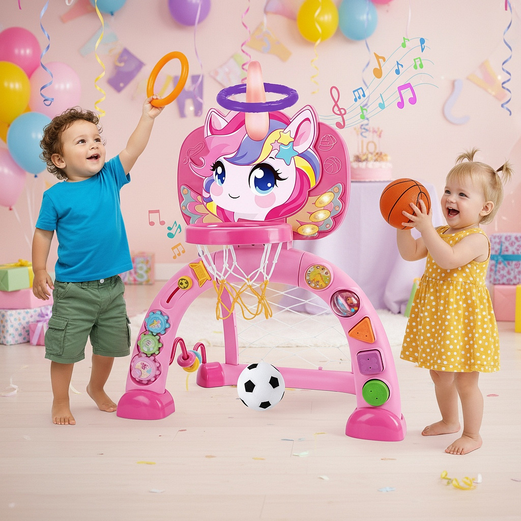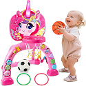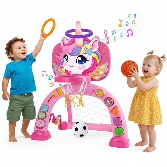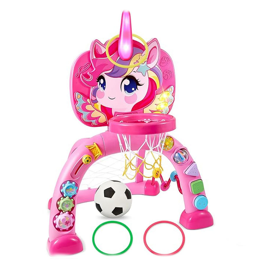 Centrum sportowe 3 w 1 z uroczą tematyką jednorożca łączy koszykówkę, piłkę nożną i rzut obręczą - idealne dla maluchów 12-36 miesięcy.