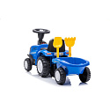 K traktůrku je připojen přívěs s hráběmi a lopatkou.