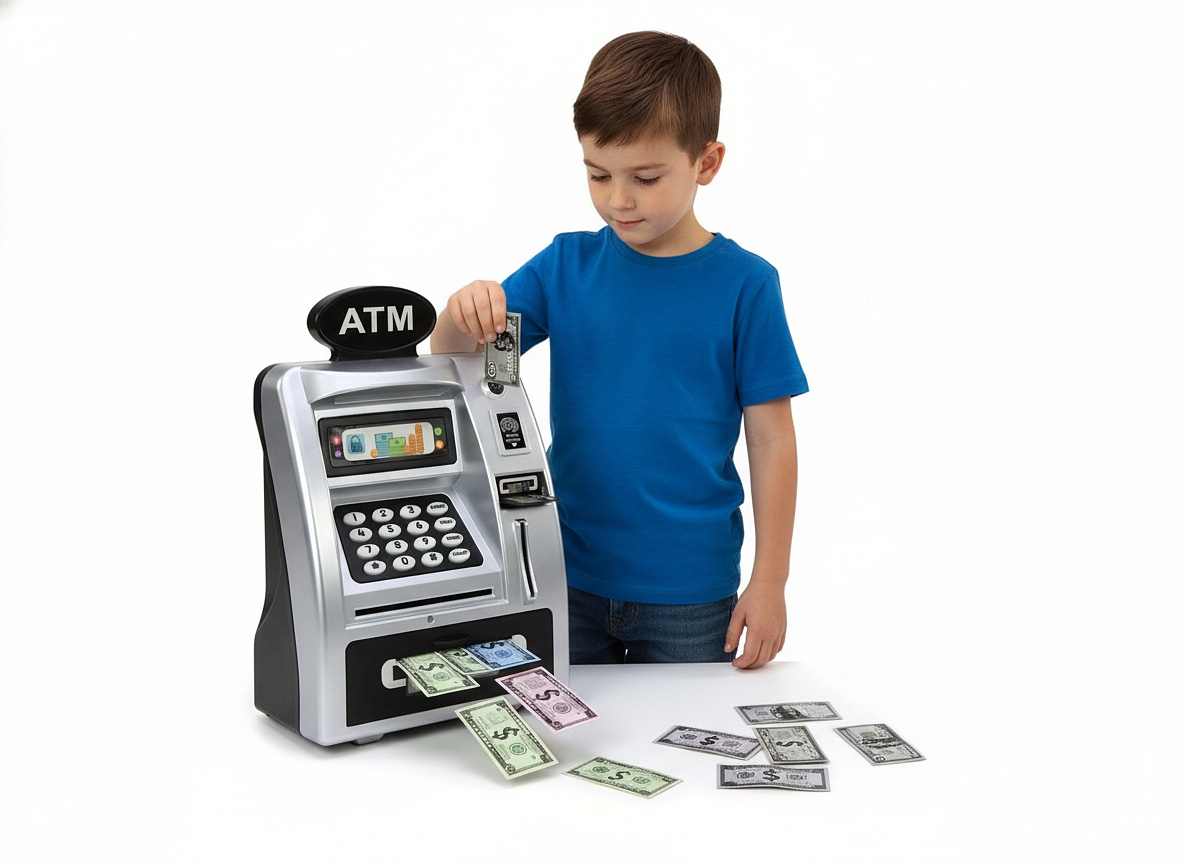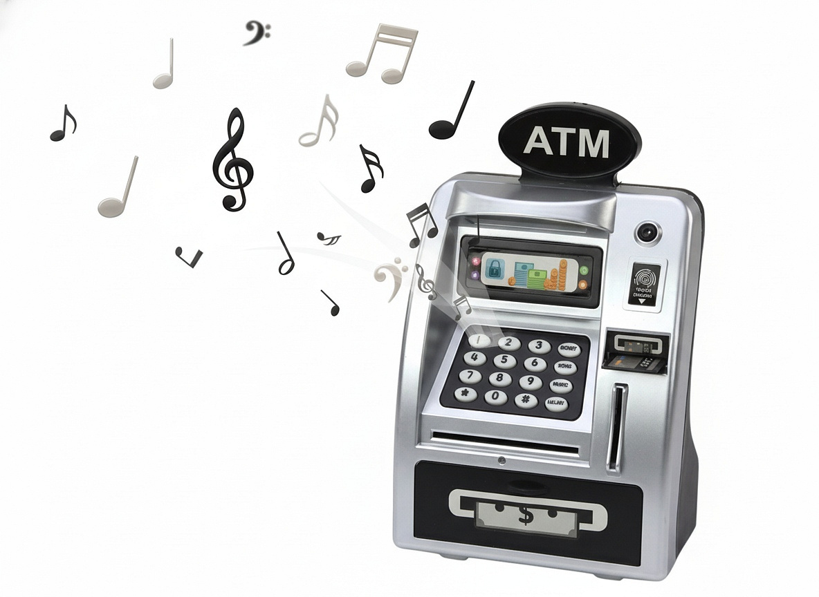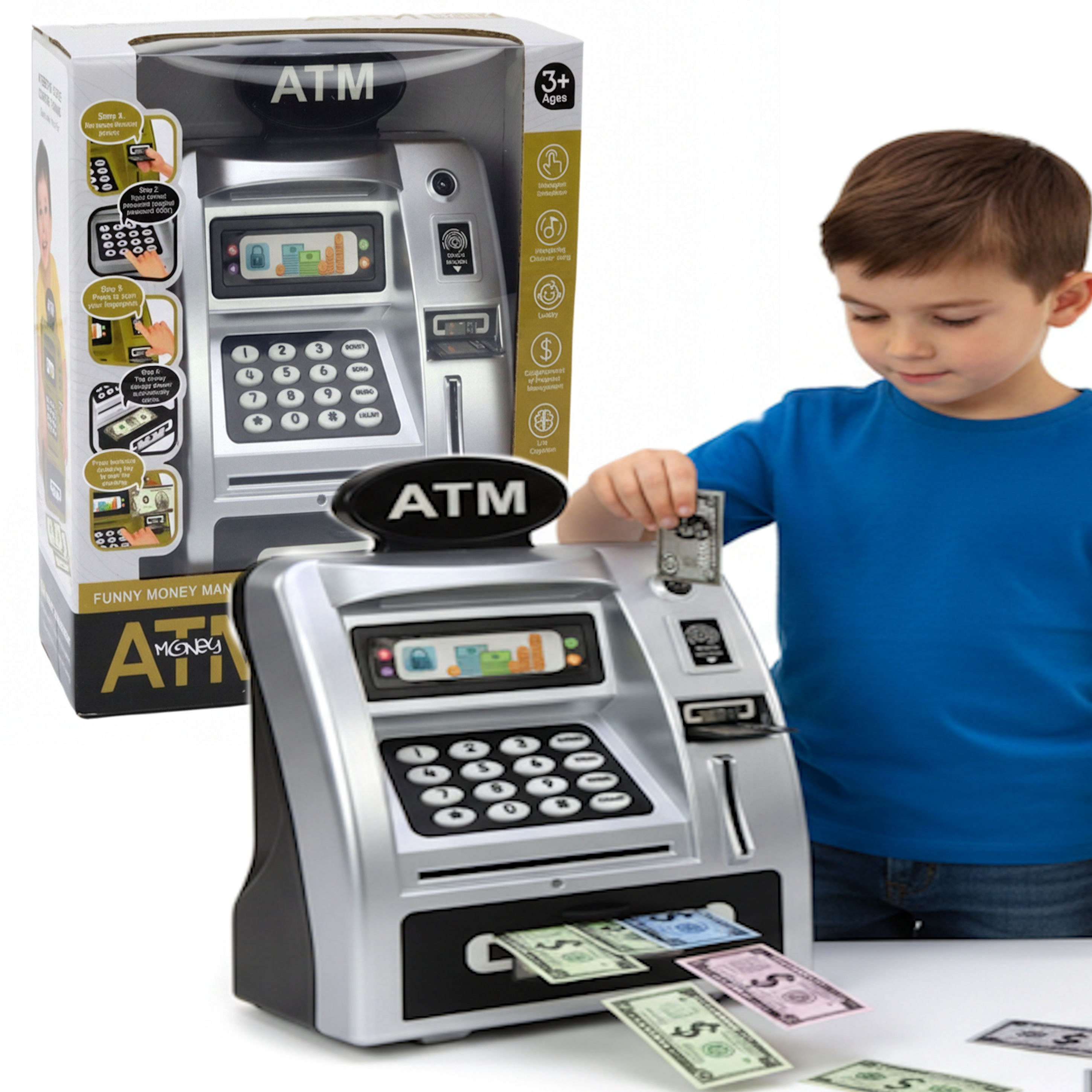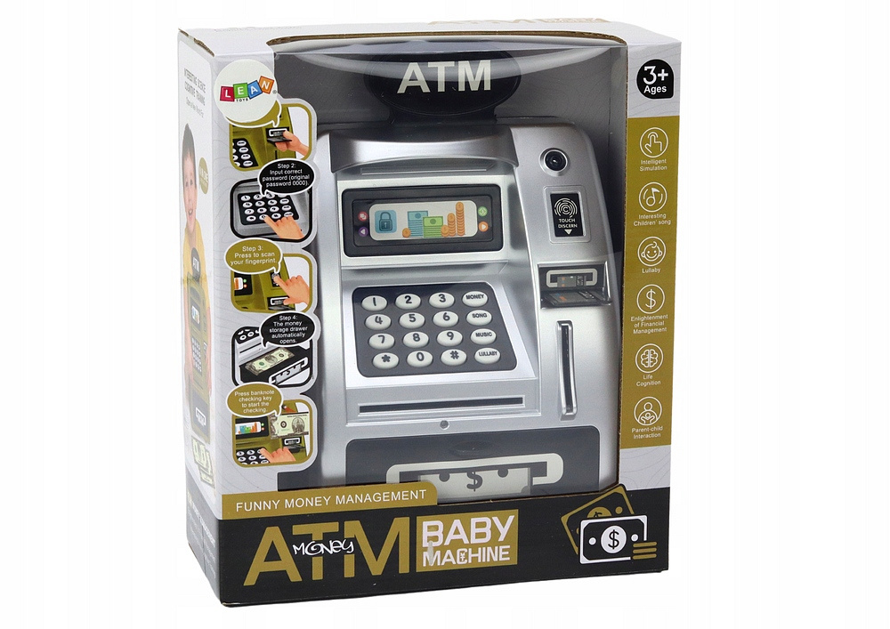 Zabawowy bankomat w eleganckim złoto-czarnym kolorze to edukacyjna skarbonka, która uczy oszczędzania przez zabawę. Wykonany z trwałego plastiku, wyposażony w czytnik linii papilarnych, plastikową kartę, możliwość ustawienia własnego PIN-u i efekty dźwiękowo-świetlne - po udanej autoryzacji rozbrzmiewają fanfary!