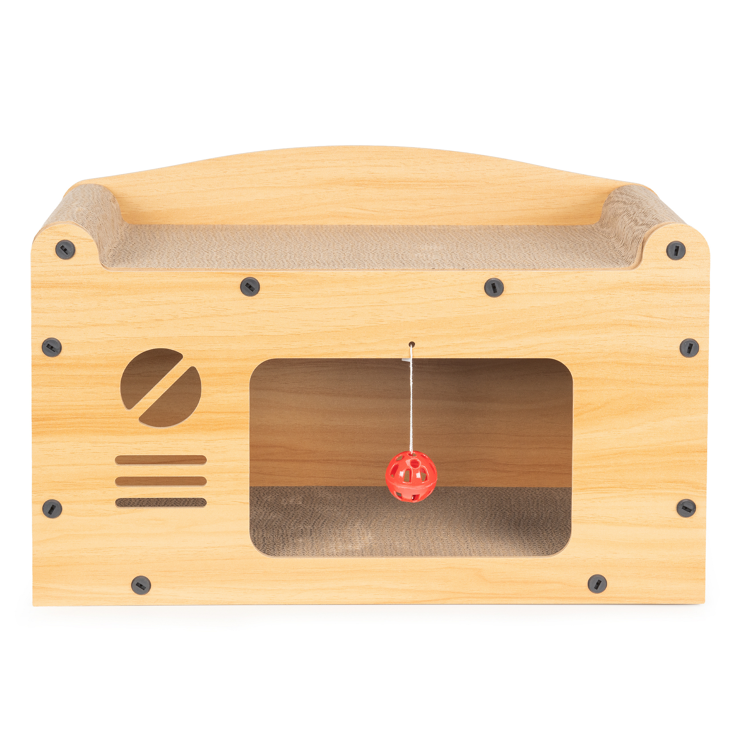 Škrabadlo Lebula má podobu útulné boudy, která plní dvojí roli: slouží jako úkryt i pohodlné místo k odpočinku. Konstrukce byla vyrobena z odolné vlnité lepenky - materiálu, který kočky rády škrábou - a pevných dřevěných prvků zajišťujících stabilitu a trvanlivost.