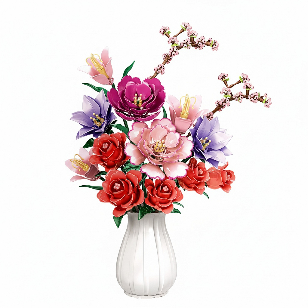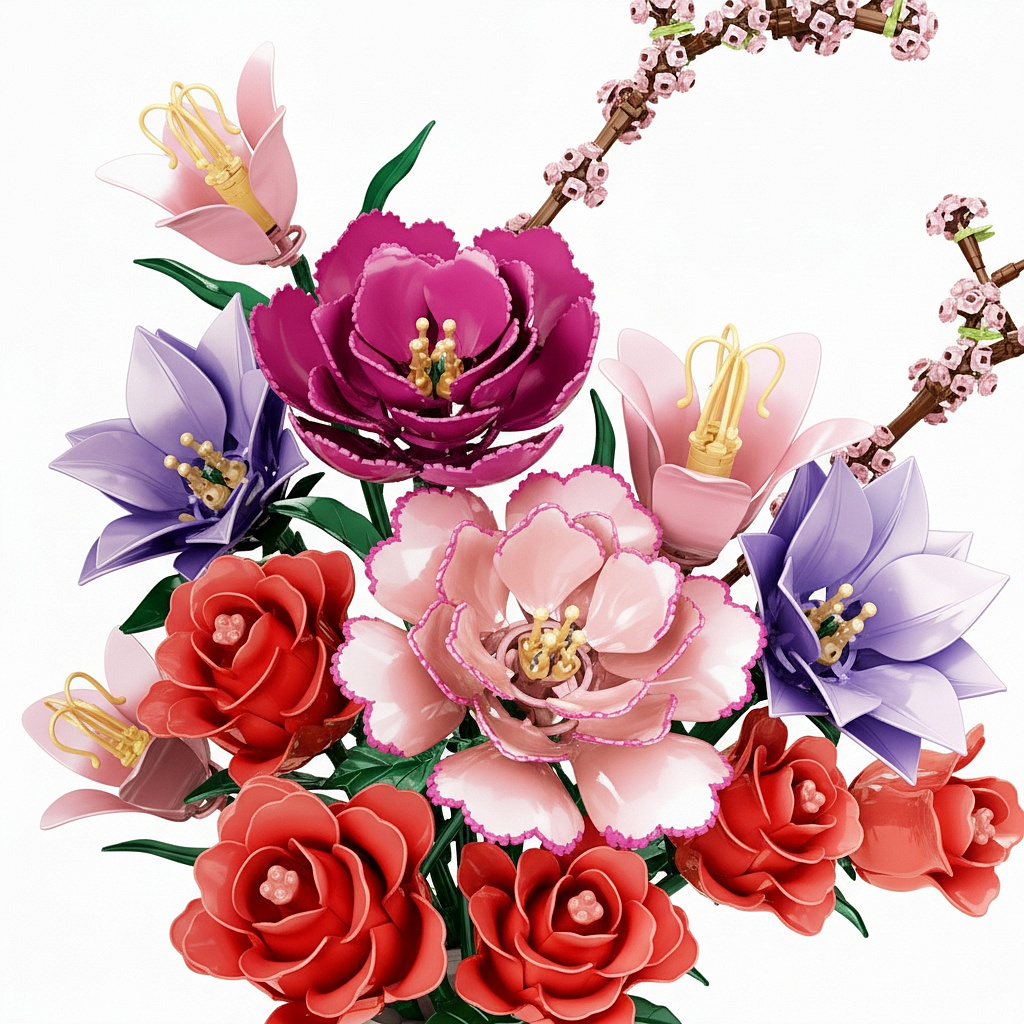 Stwórz własny wieczny bukiet z 12 realistycznych kwiatów - róż, piwonii, lilii i innych - zbudowanych z 769 bezpiecznych elementów ABS. Każda łodyga jest niezależna, dzięki czemu możesz dowolnie komponować aranżację i dostosować długość do każdego wazonu.