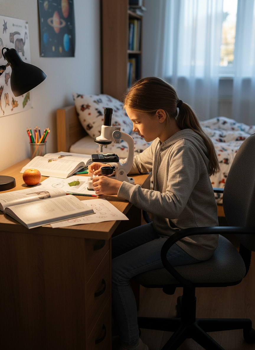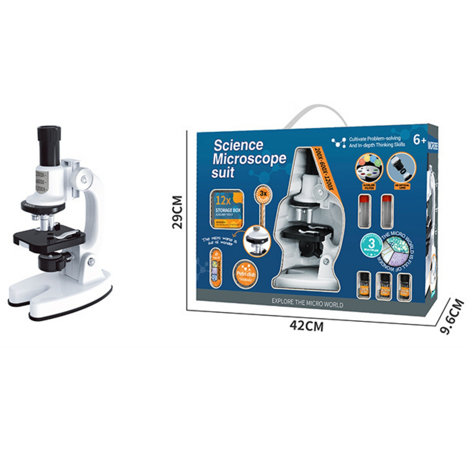 Umožní objevovat tajemství světa vědy. Má možnost velmi velkého zvětšení 200x, 600x, 1200x. Mikroskop má 4barevný filtr pro pozorování.