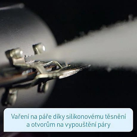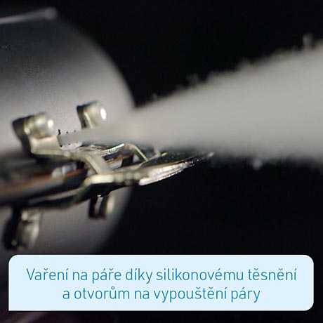 Flexibilní, silikonové těsnění a ergonomická ručka s geniálním magnetickým uzávěrem drží pánev pevně uzavřenou. Tím je zaručeno perfektní vařní prostředí. Nadbytečná pára se vypaří otvory k tomu určenými.