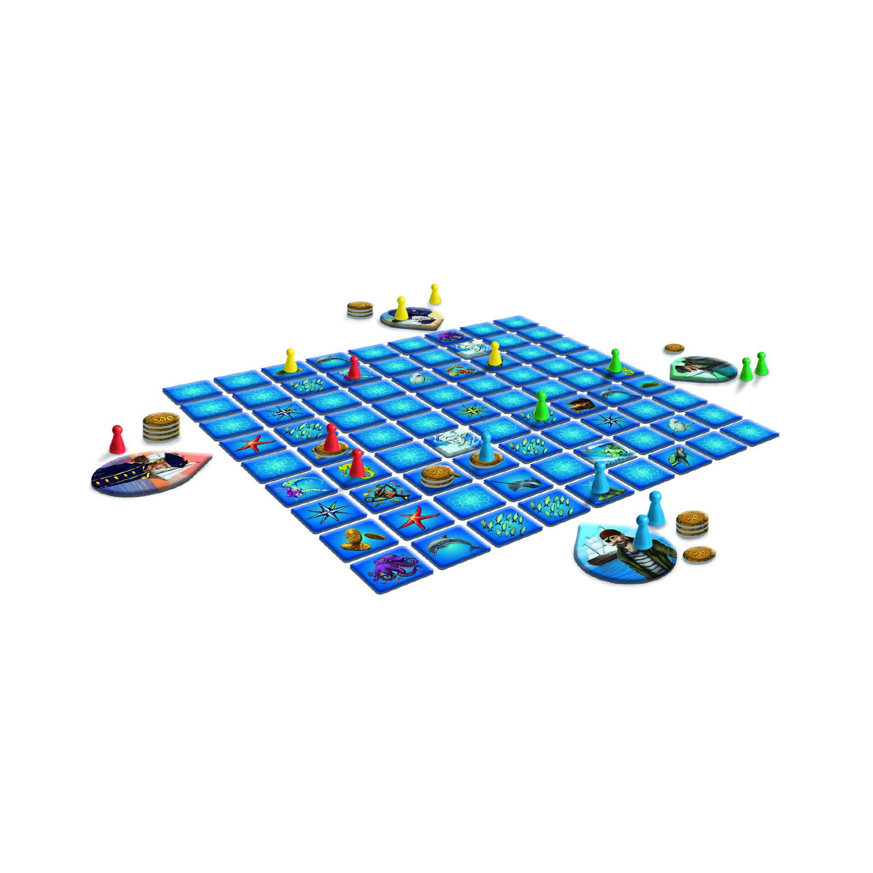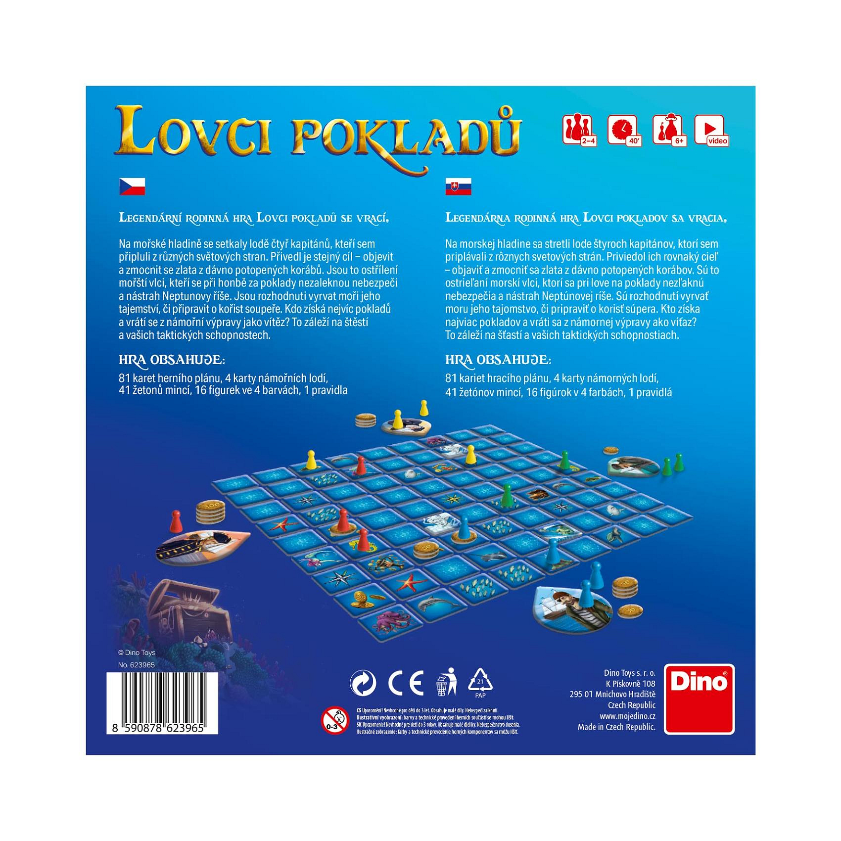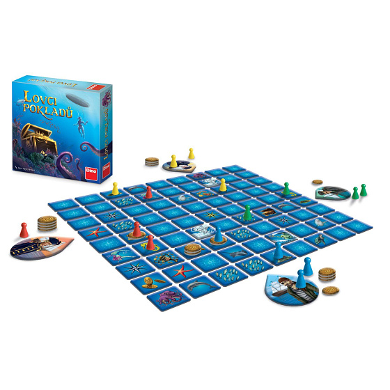 Kdy naposled jste našli opravdový poklad? Vašim dětem se tenhle zázrak může dít každý den. Hra Lovci pokladů je určena pro 2 až 4 hráče a pochopí ji už žáčci první třídy. Během hry budou za pomoci svých námořníků hledat, přepravovat a také chránit na své lodi co největší poklad. V tom mu mohou pomáhat mořští koníci nebo bránit třeba zlí žraloci. Ještě větší moc pak má mořská panna nebo vládce moří, Neptun. Vítězí ten, kdo nasbírá největší hodnotu pokladů. Děti si při hře procvičí strategické uvažování, postřeh i počty. Balení obsahuje: 81 karet herního plánu, 4 karty námořních lodí, 41 žetonů mincí, 16 figurek námořníků ve 4 barvách, pravidla. Rozměr krabice: 24 x 24 x 6 cm Vhodné pro děti od 6 let