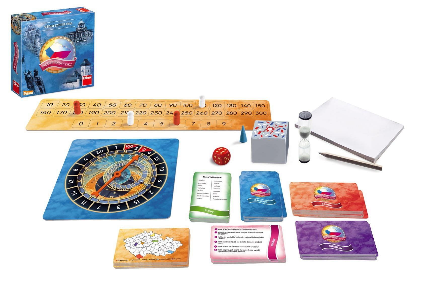 Užijte si stejnou dávku napětí, jakou znají soutěžící z televizního pořadu Máme rádi Česko. Vědomostní hra na motivy populární TV soutěže proti sobě staví dva týmy, které poměřují své znalosti o naší vlasti. Cíl je jasný – získat co nejvíce bodů ve všech disciplínách. Otestujete nejen své vědomosti, ale i kreativitu a pohotovost. Které disciplíny vás čekají? Budete hádat jména slavných českých osobností, hádat správné pojmy podle popisu kapitána týmu a podobně to bude i u kreslení, kdy musíte poznat, co chce spoluhráč svým výtvarným uměním říci. Pro milovníky zeměpisu bude lahůdkou slepá mapa, fandové adrenalinu se pobaví u bomby. Stihnete odpovědět správně dřív, než vybuchne? Na závěr ještě pořadím mohou zamíchat finálové karty. Balení obsahuje: 148 karet, 5 figurek, 1 přesýpací hodiny (1,5 minuty), 1 hrací kostka, 1 bloček, 1 tužka, 1 bodovací tabulka, 1 tikající bomba, 1 kolo štěstí. Rozměry balení 24 x 24 x 6 cm. Vhodné pro děti od 10 let.