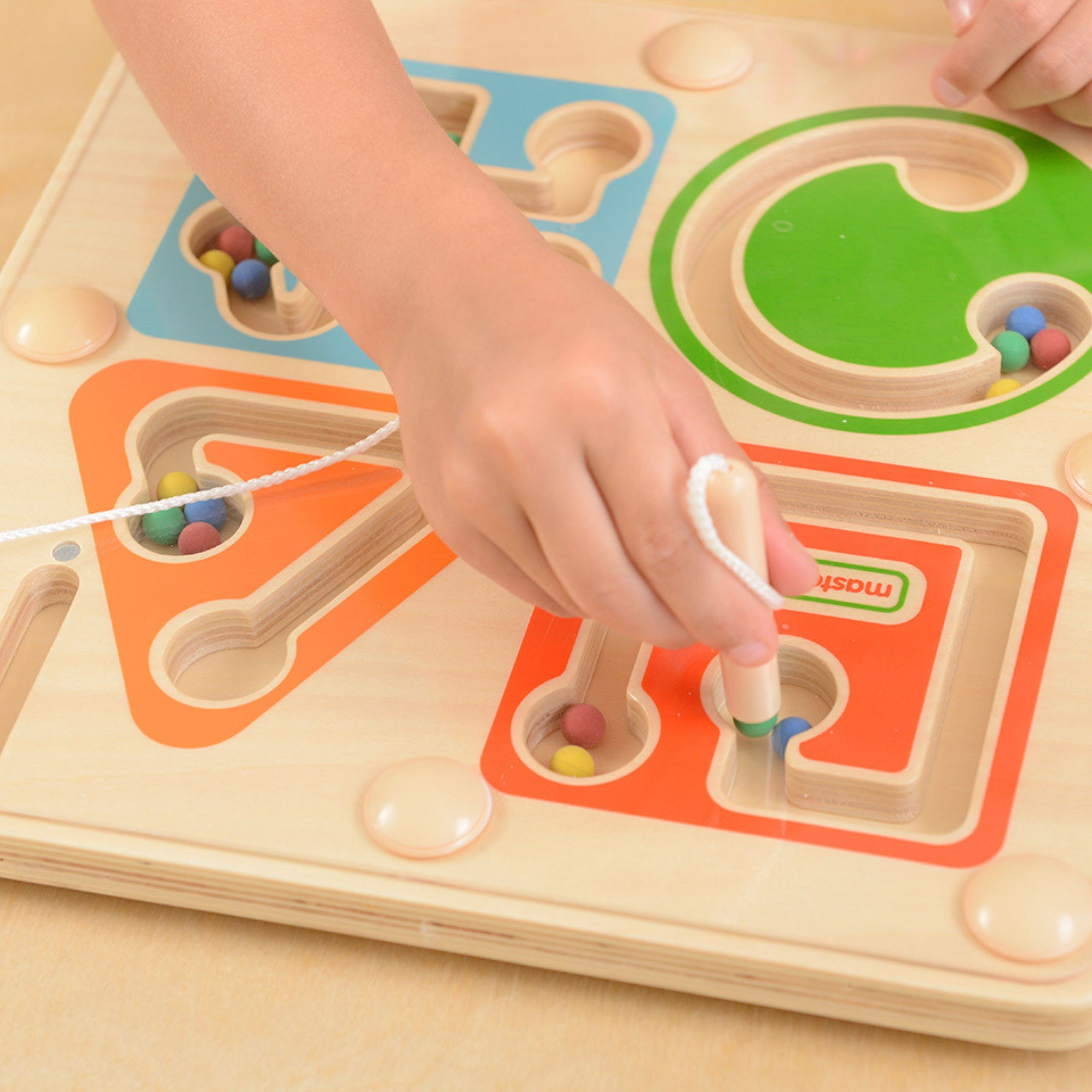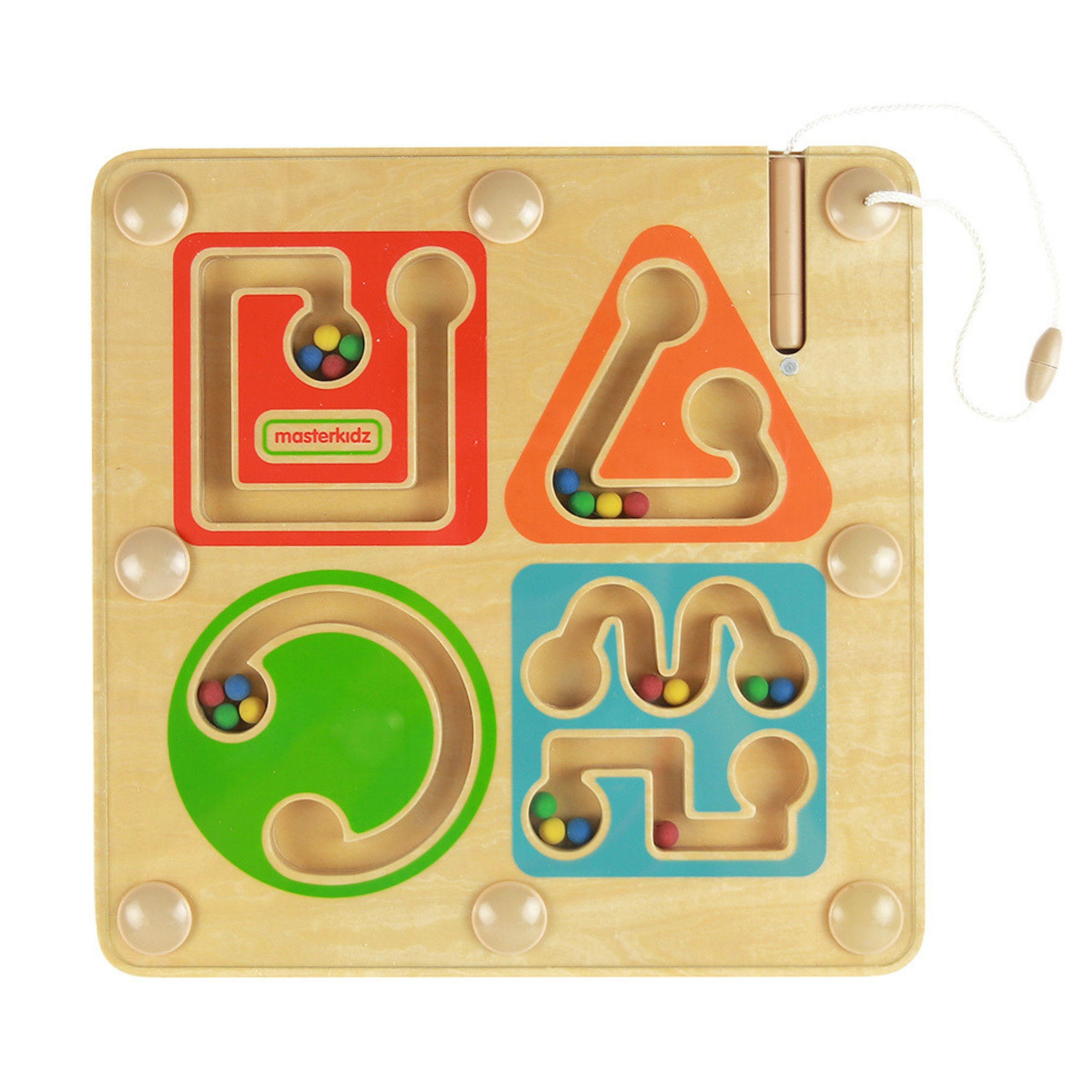 Drewniany Labirynt Magnetyczny to fascynująca tablica edukacyjna od marki Masterkidz, która przygotuje rączkę Twojego dziecka do nauki pisania, zamieniając żmudne ćwiczenia w świetną zabawę. Maluch za pomocą bezpiecznego, magnetycznego rysika na sznureczku ma za zadanie przeprowadzić kolorowe kuleczki przez cztery zakręcone tory o różnych kształtach geometrycznych. Ta sprytna konstrukcja stanowi progresywny trening dla dłoni – od prostych ruchów po precyzyjne manewrowanie. Zamknięty system labiryntów sprawia, że jest to zabawka idealna zarówno do domu, jak i w podróż – żadna kuleczka nigdy się nie zgubi, a dziecko może bezpiecznie trenować koncentrację. To solidnie wykonana pomoc dydaktyczna, która rzuca wyzwanie koordynacji wzrokowo-ruchowej, oferując satysfakcję z każdego pokonanego zakrętu.