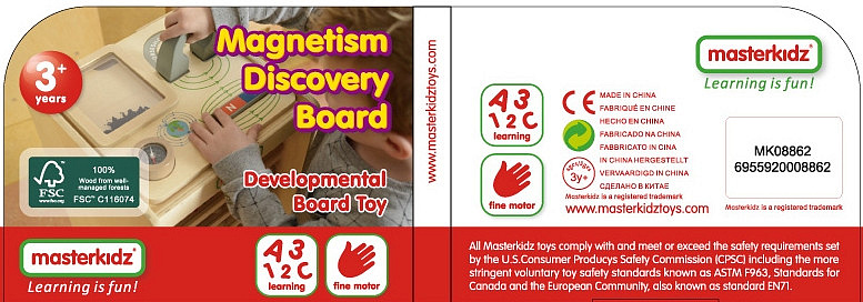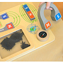 Drewniana tabliczka edukacyjna, dzięki której dziecko będzie mogło na własne oczy zobaczyć jak działa magnes. Zabawka zawiera duży magnes w kształcie podkowy, z oznaczonymi biegunami, a także magnes w kształcie bloczka. Na tabliczce znajduje się również pojemniczek z opiłkami żelaza. Przyciągając je, dziecko może obserwować linie magnetyczne. Zabawka posiada również kompas.
