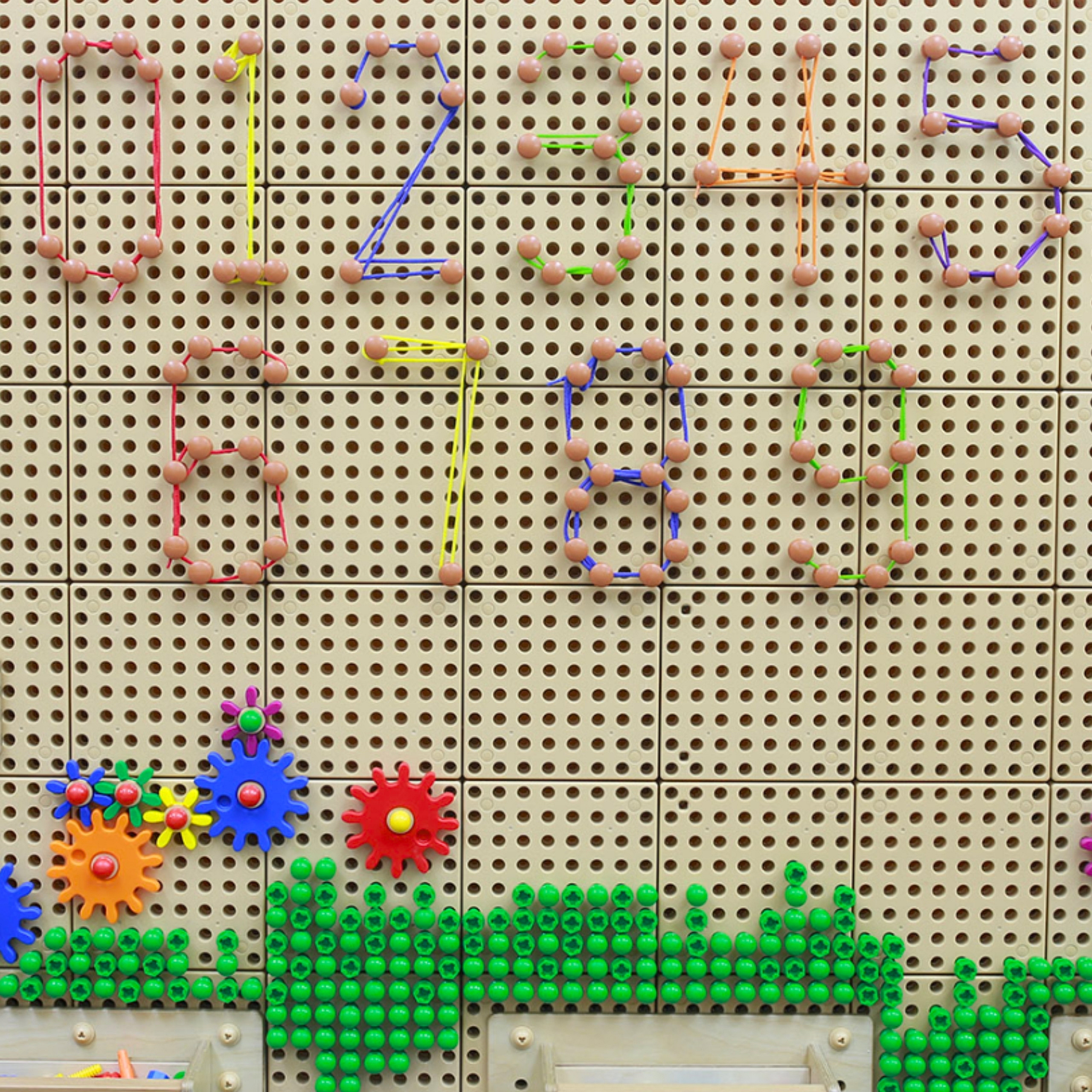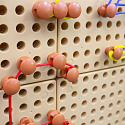 Umieść kołki w odpowiednich miejscach, a następnie połącz je za pomocą kolorowych sznurków. Tym sposobem można "rysować" literki, cyferki, figury geometryczne, a także wszystko inne, co nam przyjdzie do głowy.