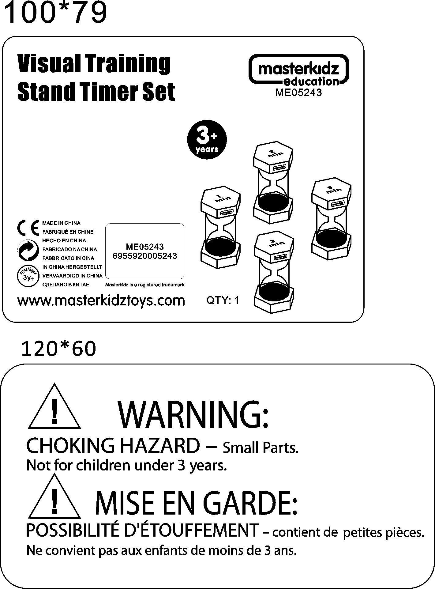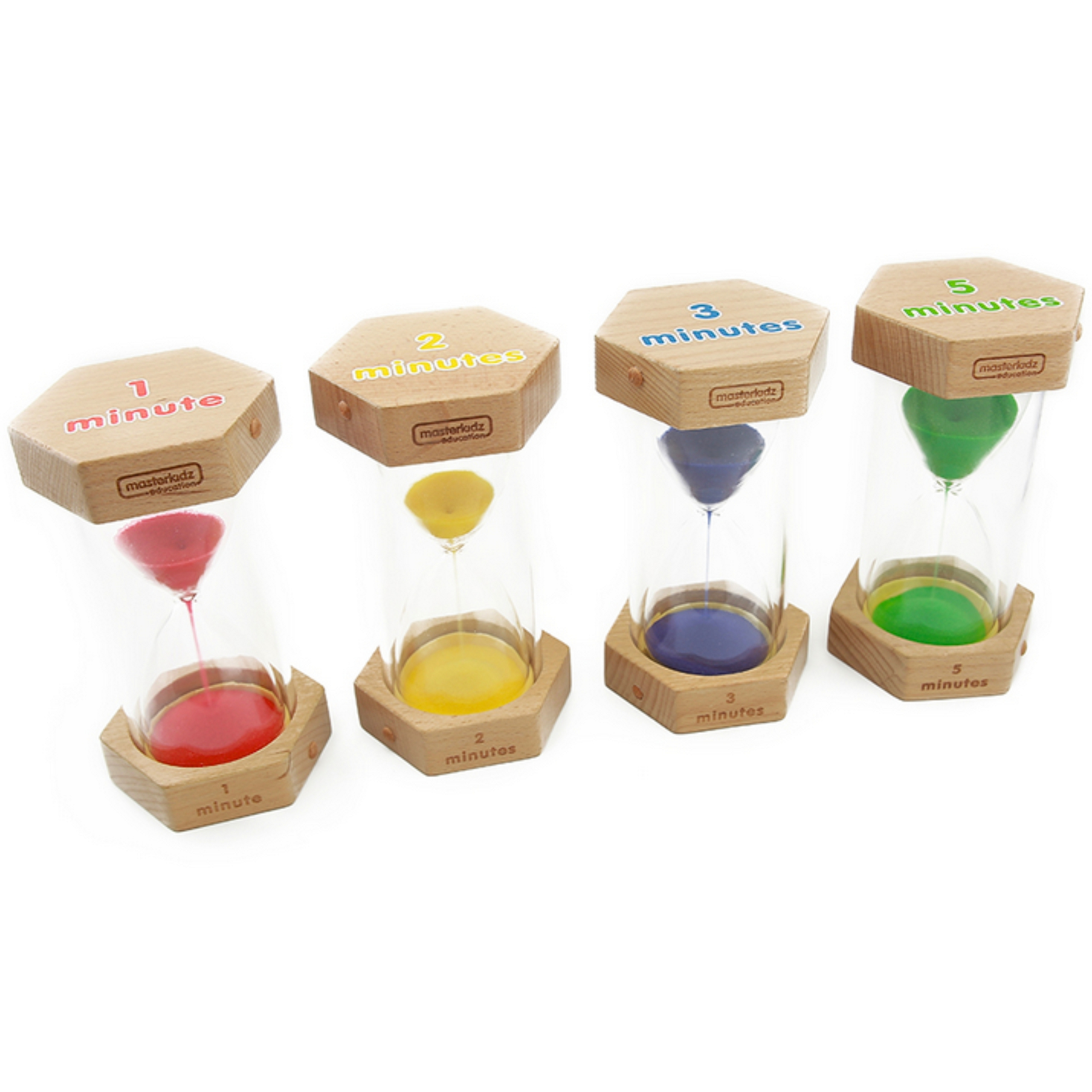 Komplet 4 klepsydr, które odmierzają następujące odległości w czasie: 1 minutę, 2 minuty, 3 minuty, oraz 5 minut. Mogą być wykorzystane w celu wytłumaczenia dzieciom zjawiska czasu, oraz szybkości jego upływania, a także by wykonywać działania matematyczne na czasie.