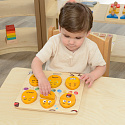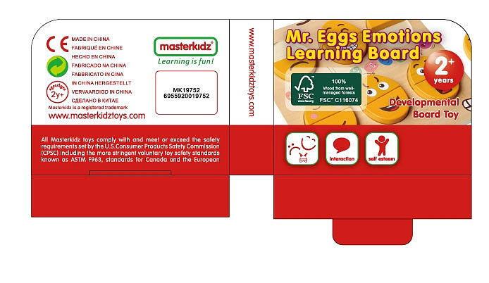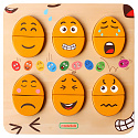 Drewniana tablica do nauki emocji marki MASTERKIDZ. Tablica została zaprojektowana, aby pomóc dzieciom rozwinąć świadomość emocjonalną i umiejętności społeczne. Dzieci mogą łączyć górną i dolną część na różne sposoby, aby uzyskać wyraz twarzy. Jest to szczególnie przydatne narzędzie zachęcające dzieci do niewerbalnego wyrażania swoich uczuć. Może być również używany jako narzędzie do nauczania dzieci o empatii, prosząc je o odgadnięcie lub odwzorowanie uczuć innych za pomocą tych klocków.