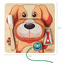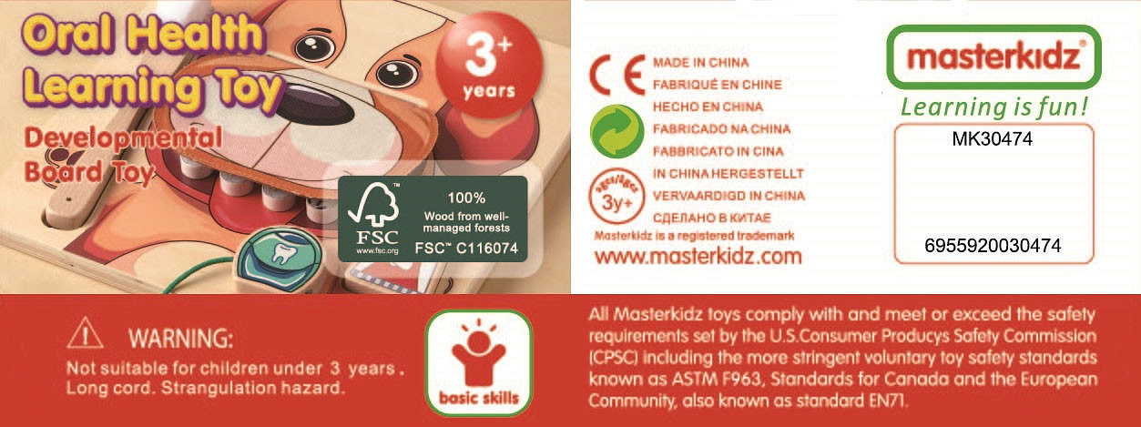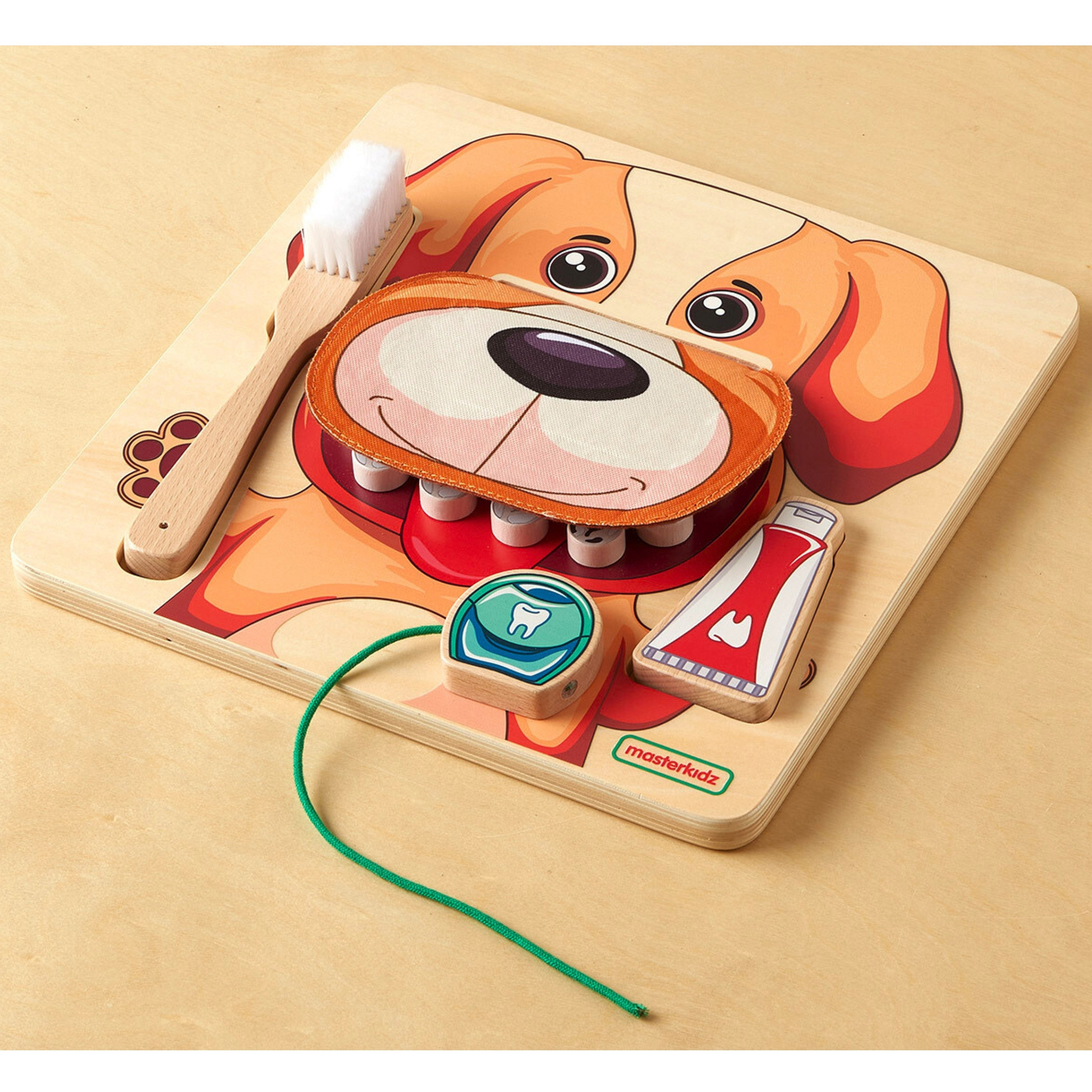 Ta edukacyjna tablica łączy zabawę w czyszczenie zębów psa z nauką o higienie jamy ustnej. Przedstawia przyjaznego psa z otwierającym się pyszczkiem, odsłaniającym 10 zębów. Zestaw zawiera zabawkową pastę, szczoteczkę i nitkę do zębów. Dzieci mogą bawić się w czyszczenie zębów psa, wyciskając pastę na szczoteczkę, szorując i nitkując zęby, co rozwija ich motorykę i precyzję. Zabawka zachęca do rozmów o dbaniu o własne zęby, a także umożliwia zabawę samodzielnie lub w parach.