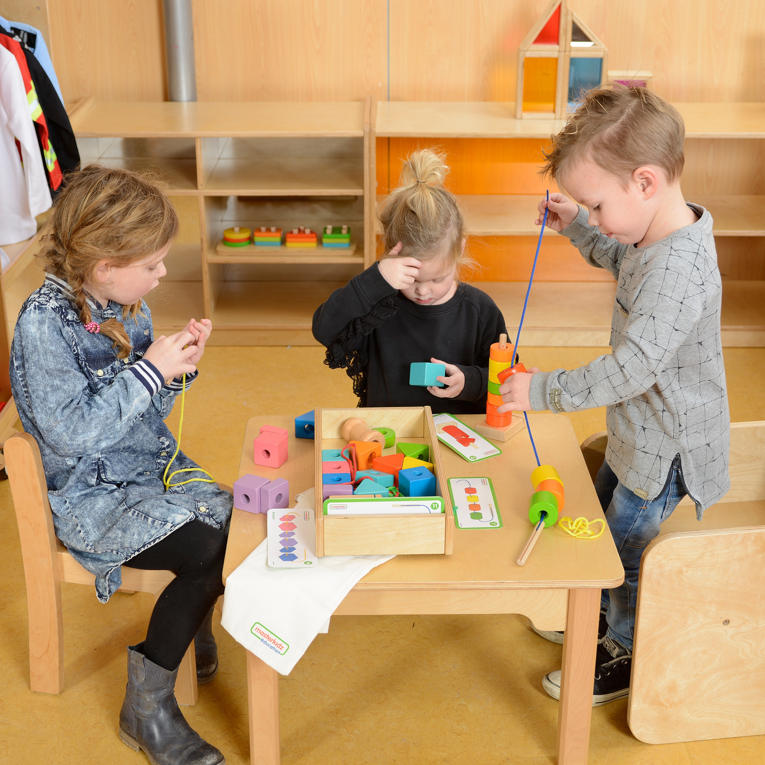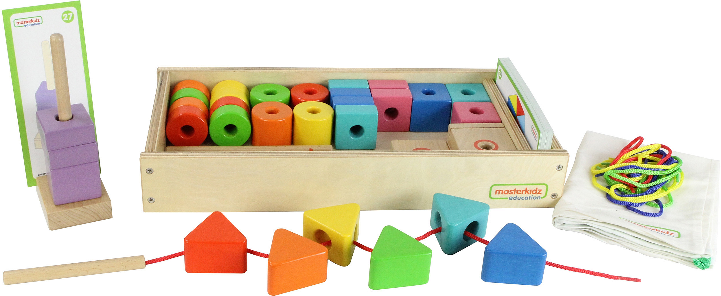 Wspaniały zestaw kolorowych koralików o różnym kolorze i kształcie, który może służyć do sortowania, liczenia, lub sznurowania. Dziecko może bawić się samodzielnie, lub użyć kart z zadaniami, które podpowiadają jakie należy układać wzory i schematy. W zestawie znajdują się również 3 podstawki, które pomagają w sznurowaniu.