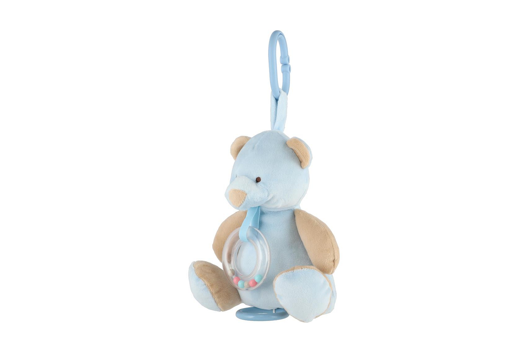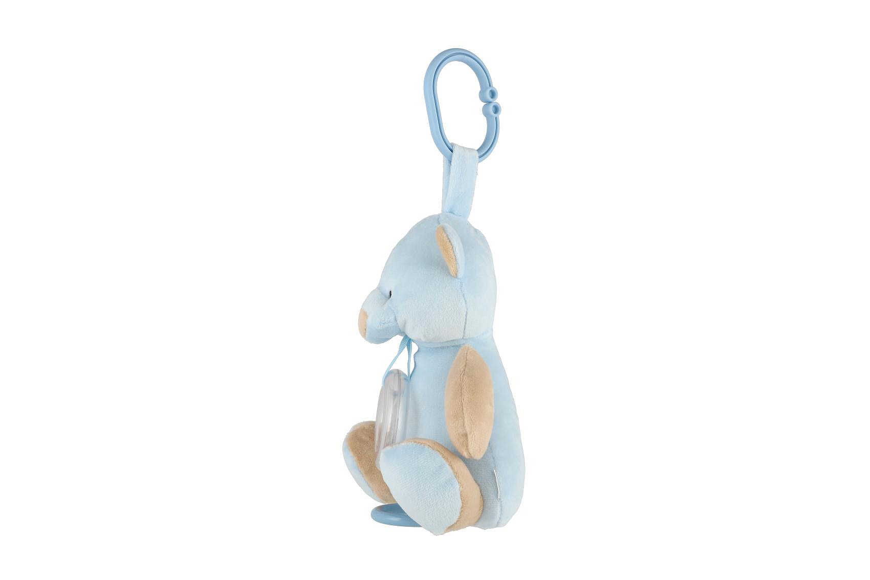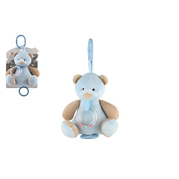 Medvěd plyš 18cm závěs na postýlku/kočárek nat. hrací strojek modrý na kartě v sáčku 0+