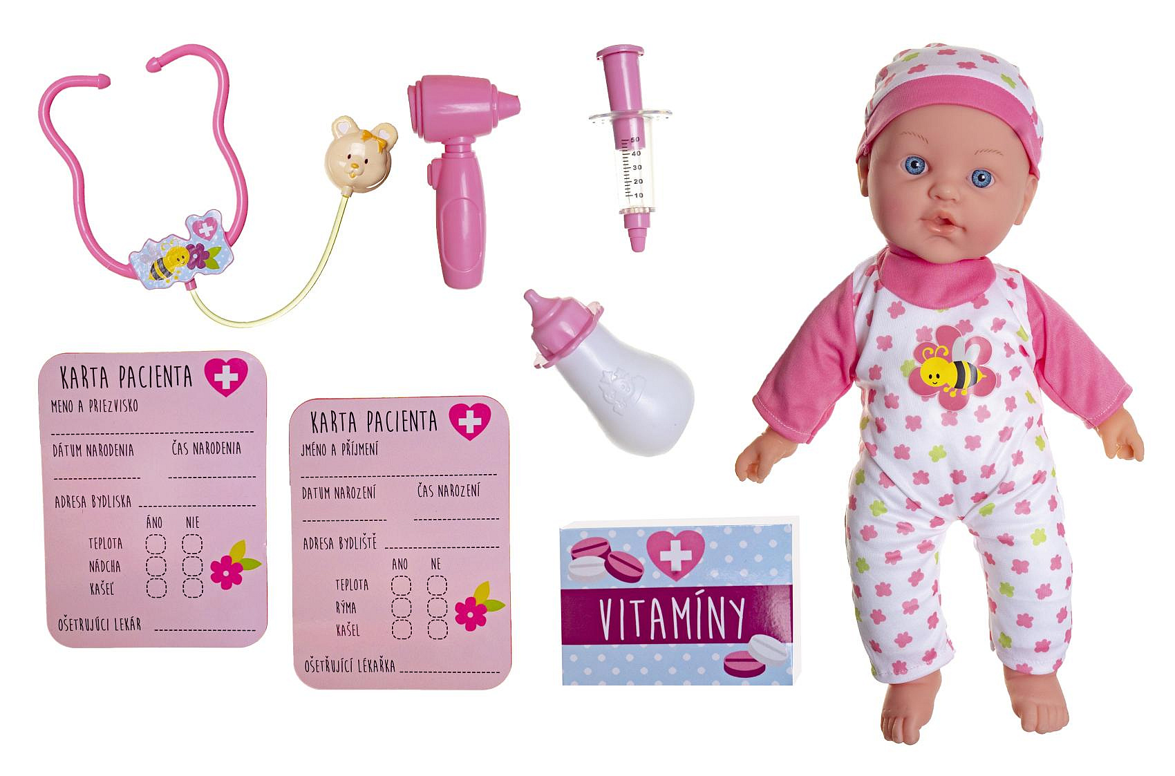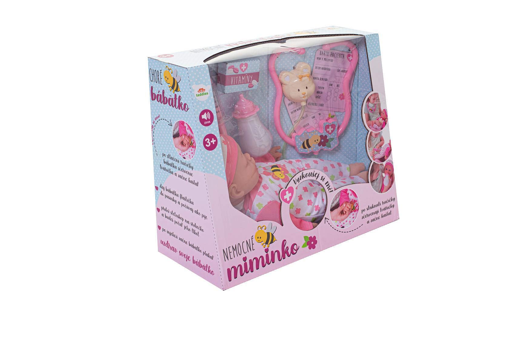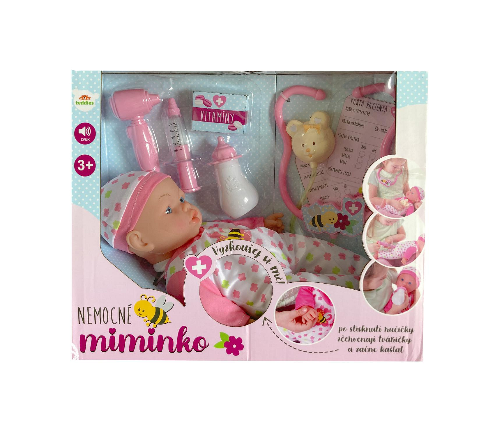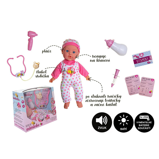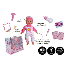 Miminko nemocné měkké tělo 36cm guma s doplňky na baterie se zvukem se světlem v krabici 37x31x17cm