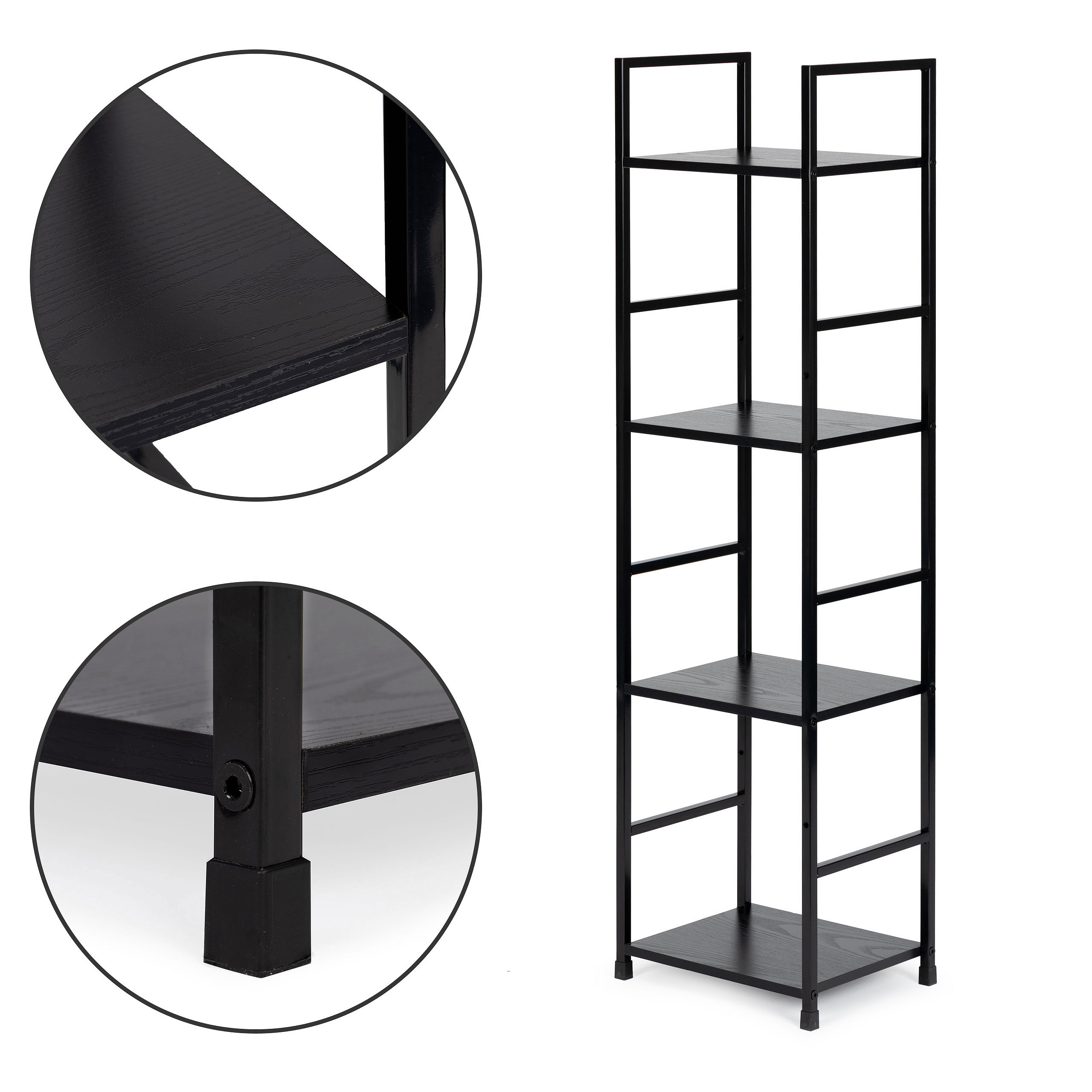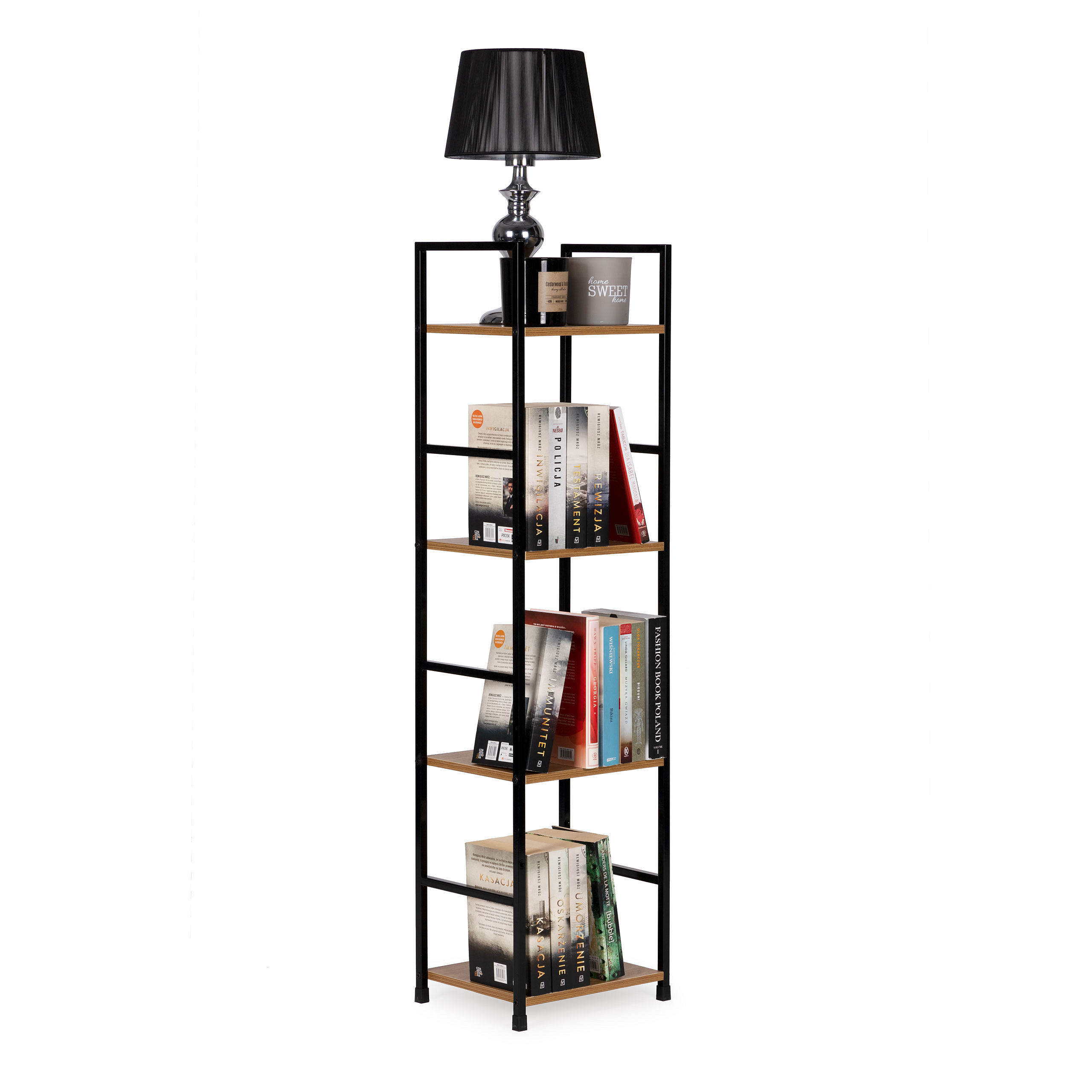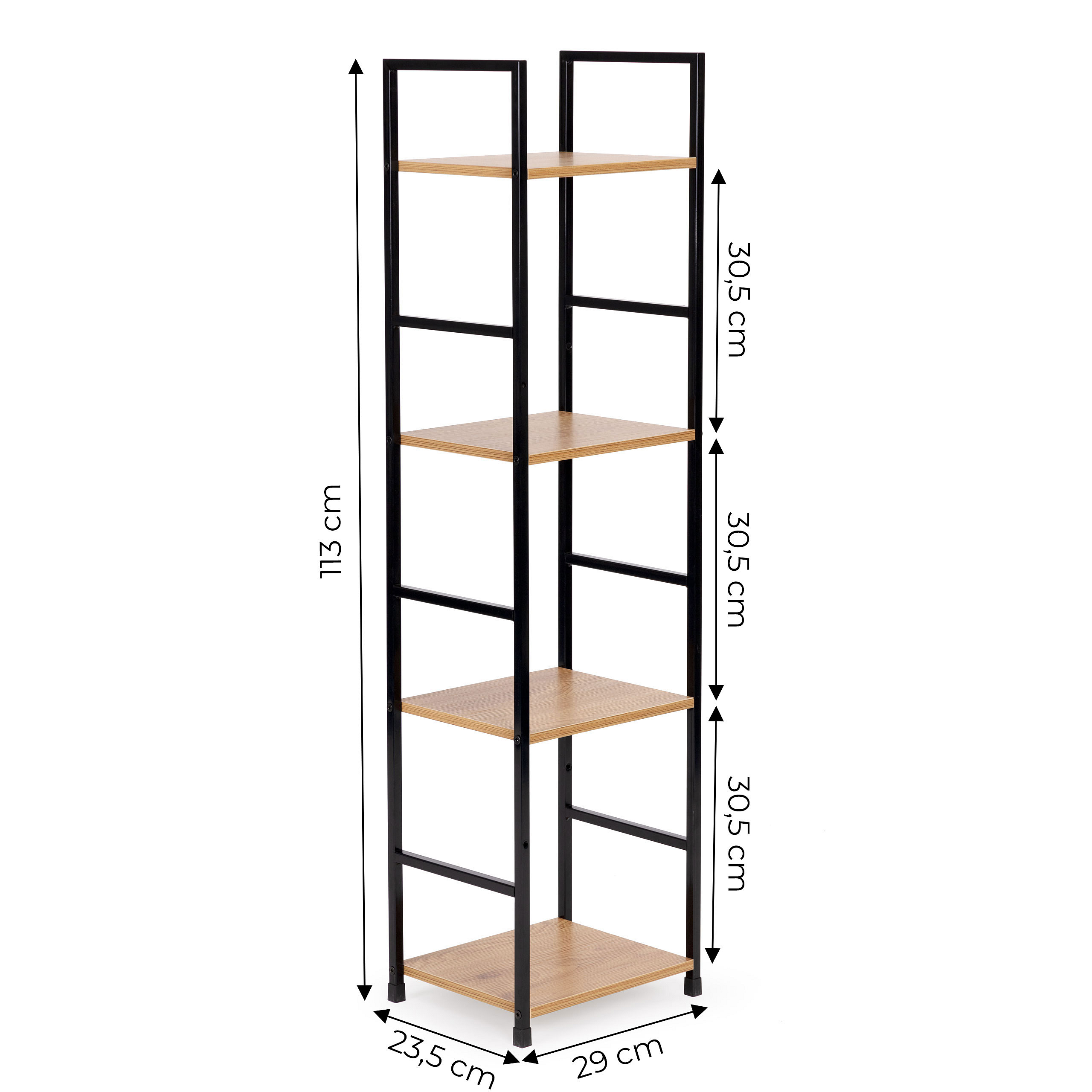 The shelves are made of MDF board covered with wood-imitating veneer . Their dimensions of 23.5 x 29 cm will accommodate everything you like to have at hand. The distance between the shelves is 31 cm. The shelf frame is made of powder-coated metal , its legs are finished with special feet that protect the floor from scratching. The frame is made of square profiles with a side of 12 mm.