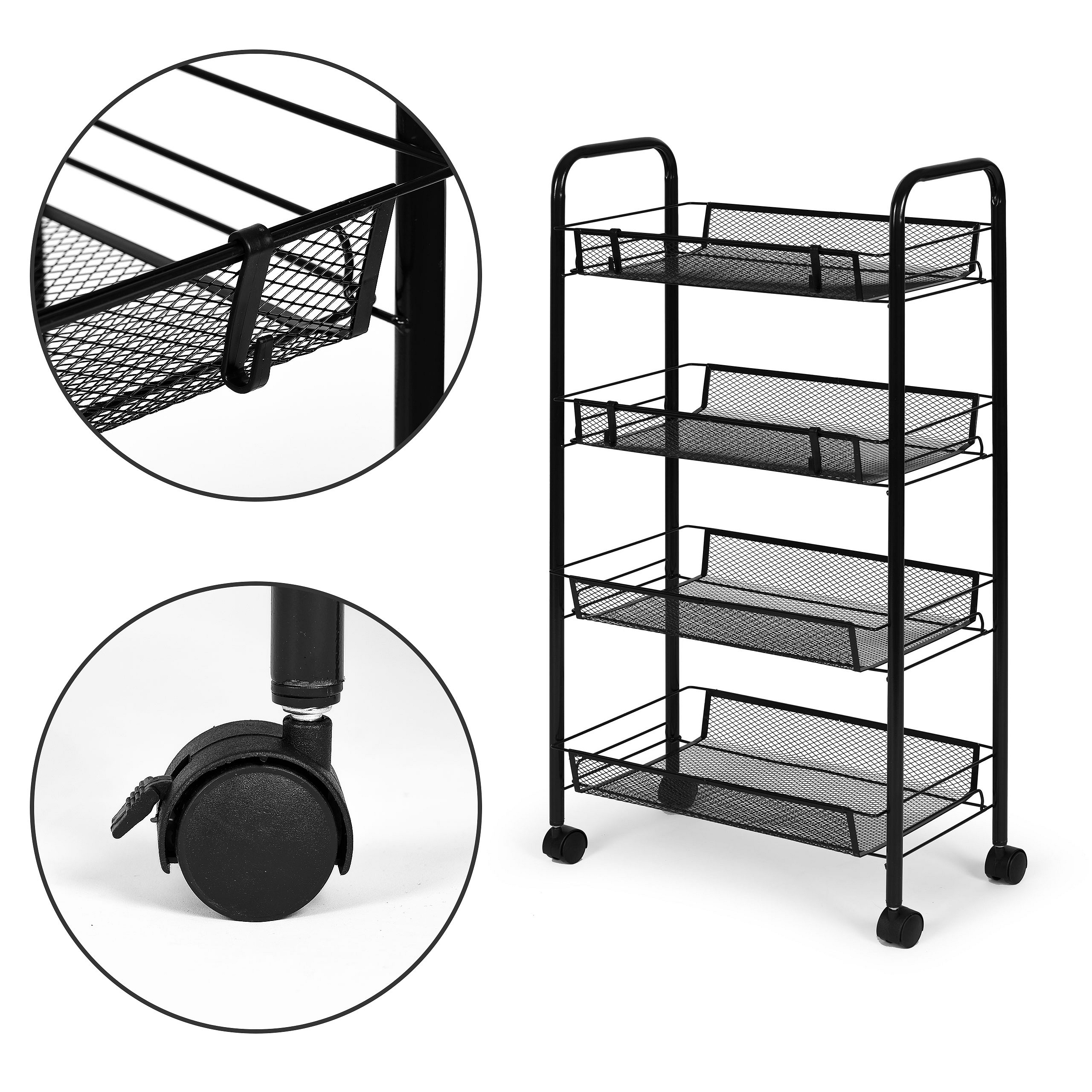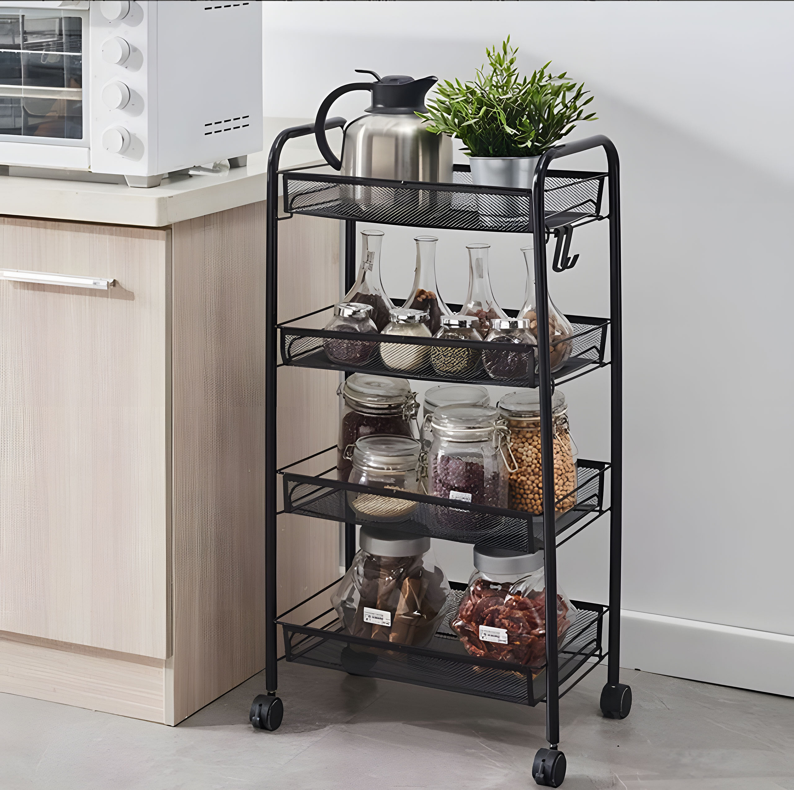 Equipped with four spacious shelves, it offers ample storage for a variety of items, such as books, kitchen accessories, tools, or decorations.