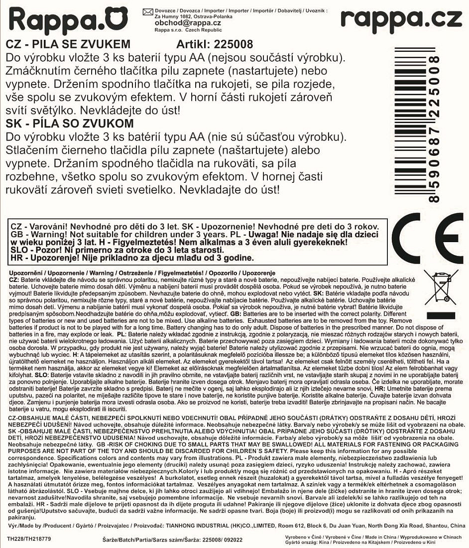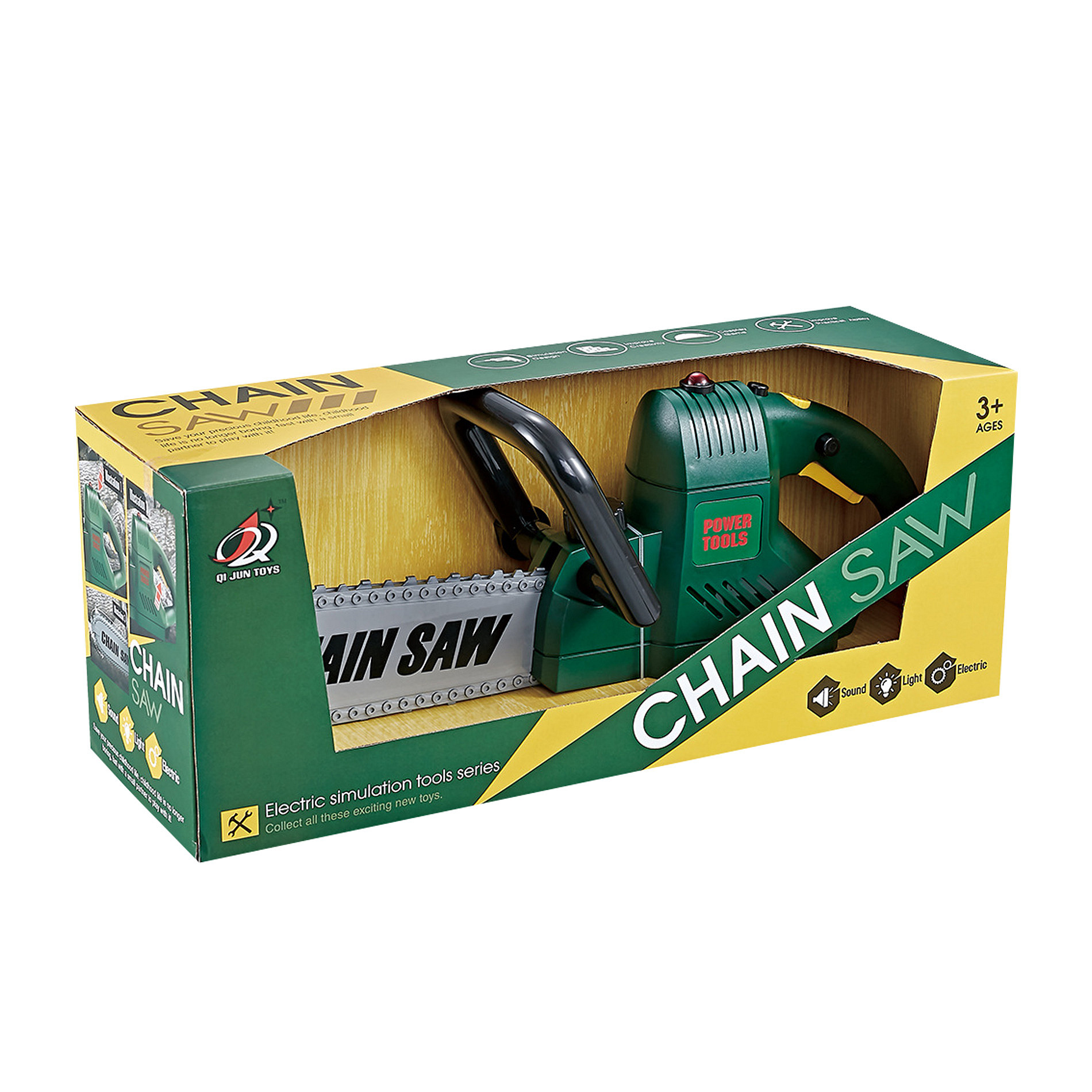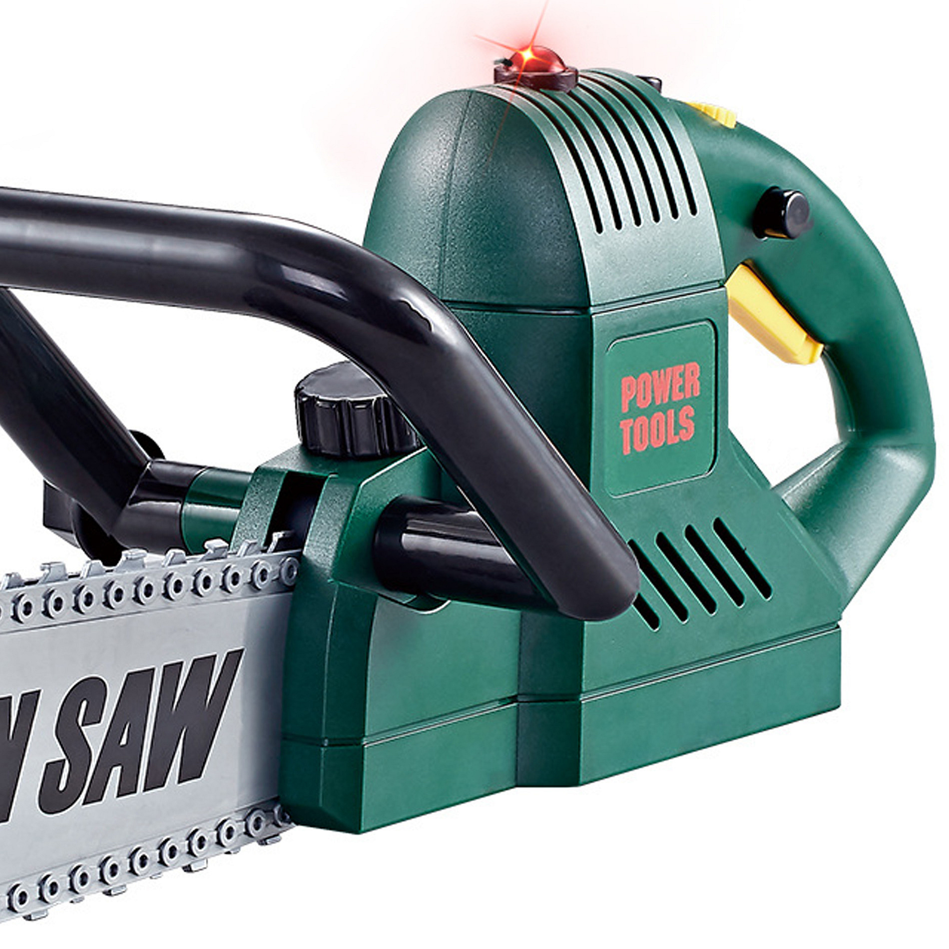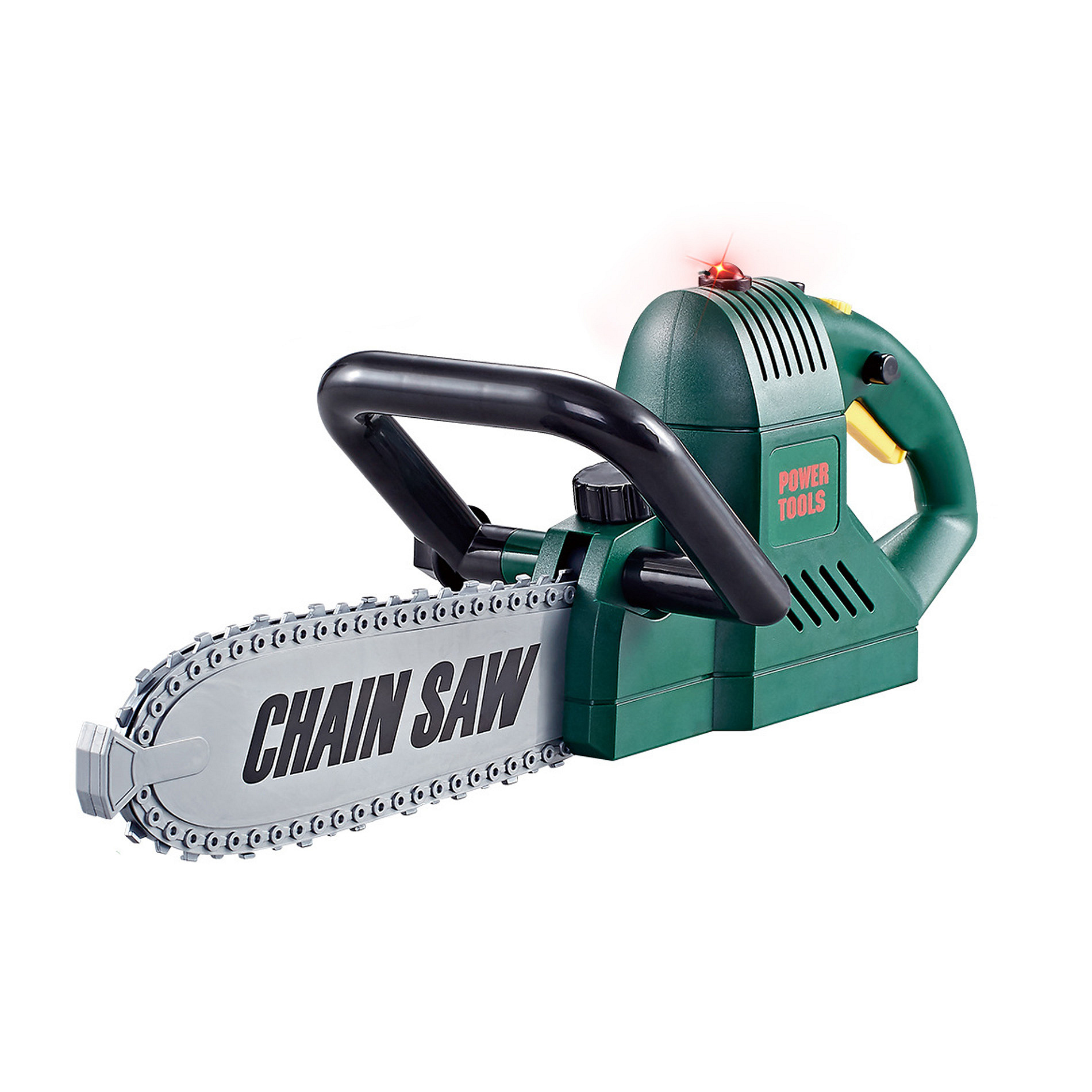 Tato motorová pila zajisté potěší všechny kluky, a to nejen z toho důvodu, že působí jako opravdová. Po zmáčknutí tlačítka vydává zvuk, rozsvítí se světýlko a řetěz se začne točit jako u skutečné pily. Funguje na 3x1.5V AA baterie, které nejsou součástí balení. Délka výrobku je cca 40 cm.