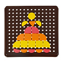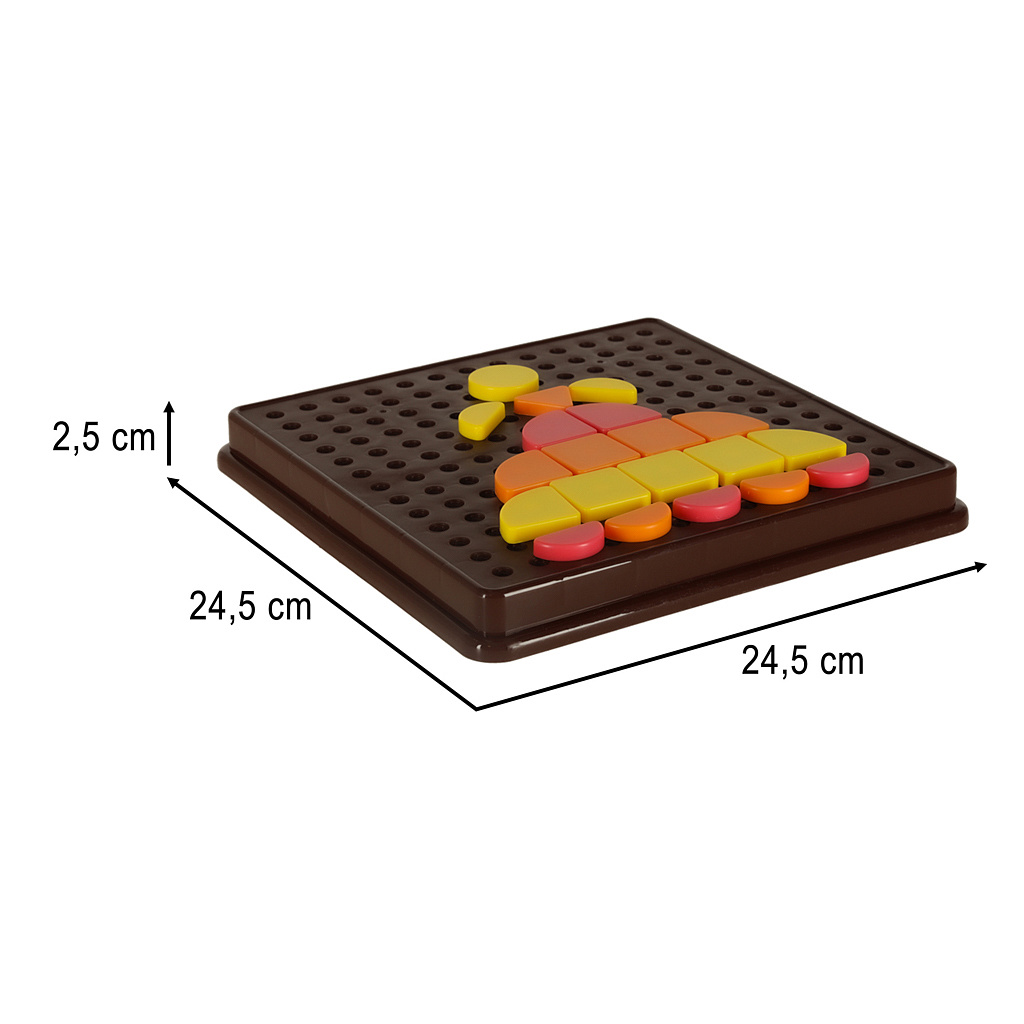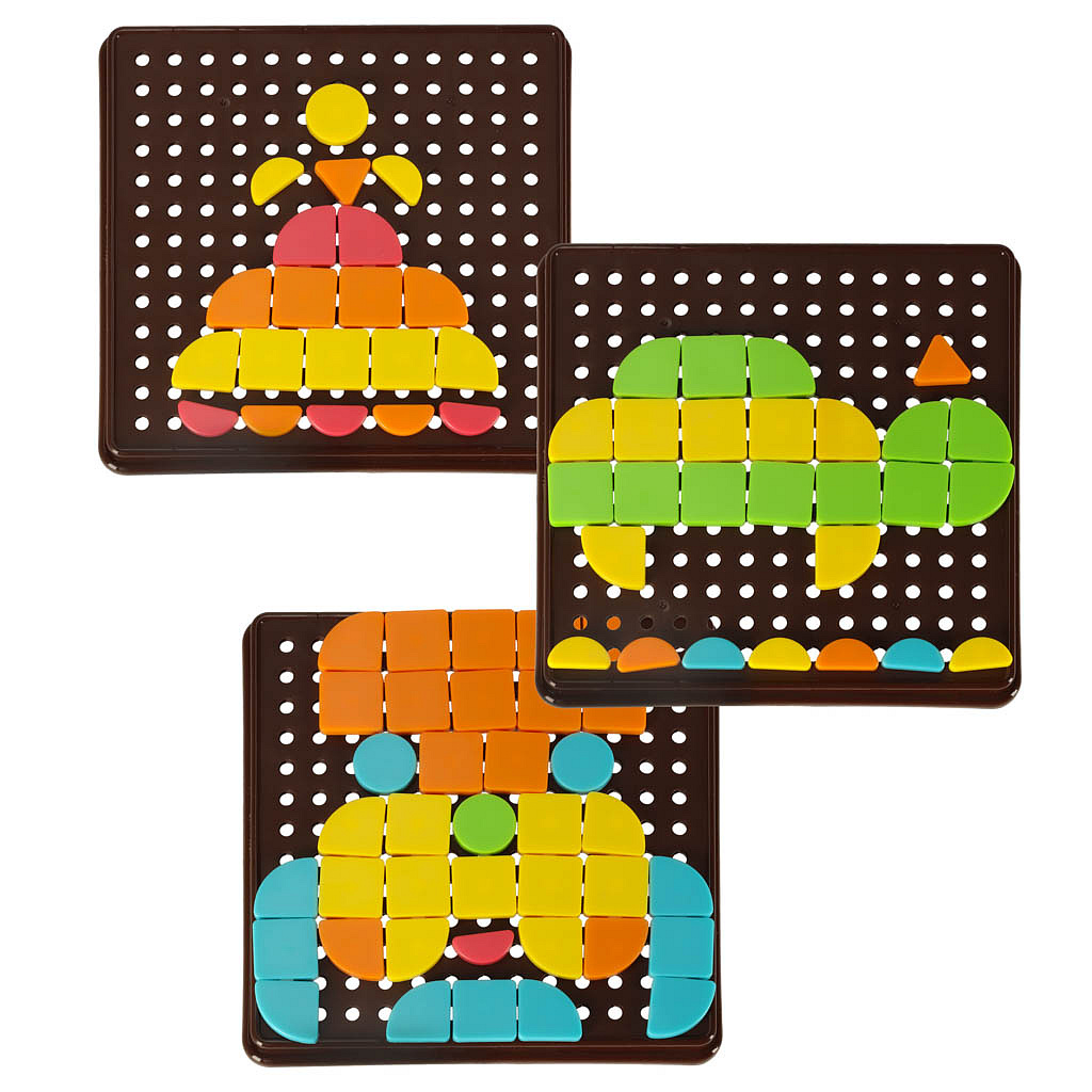 Sada obsahuje kostky v 5 různých barvách a geometrických tvarech, které lze libovolně skládat a vytvářet různé vzory a kompozice na desce. Karty s příklady obrázků umožňují dítěti rozvíjet schopnost pozorování a napodobování tvarů.
