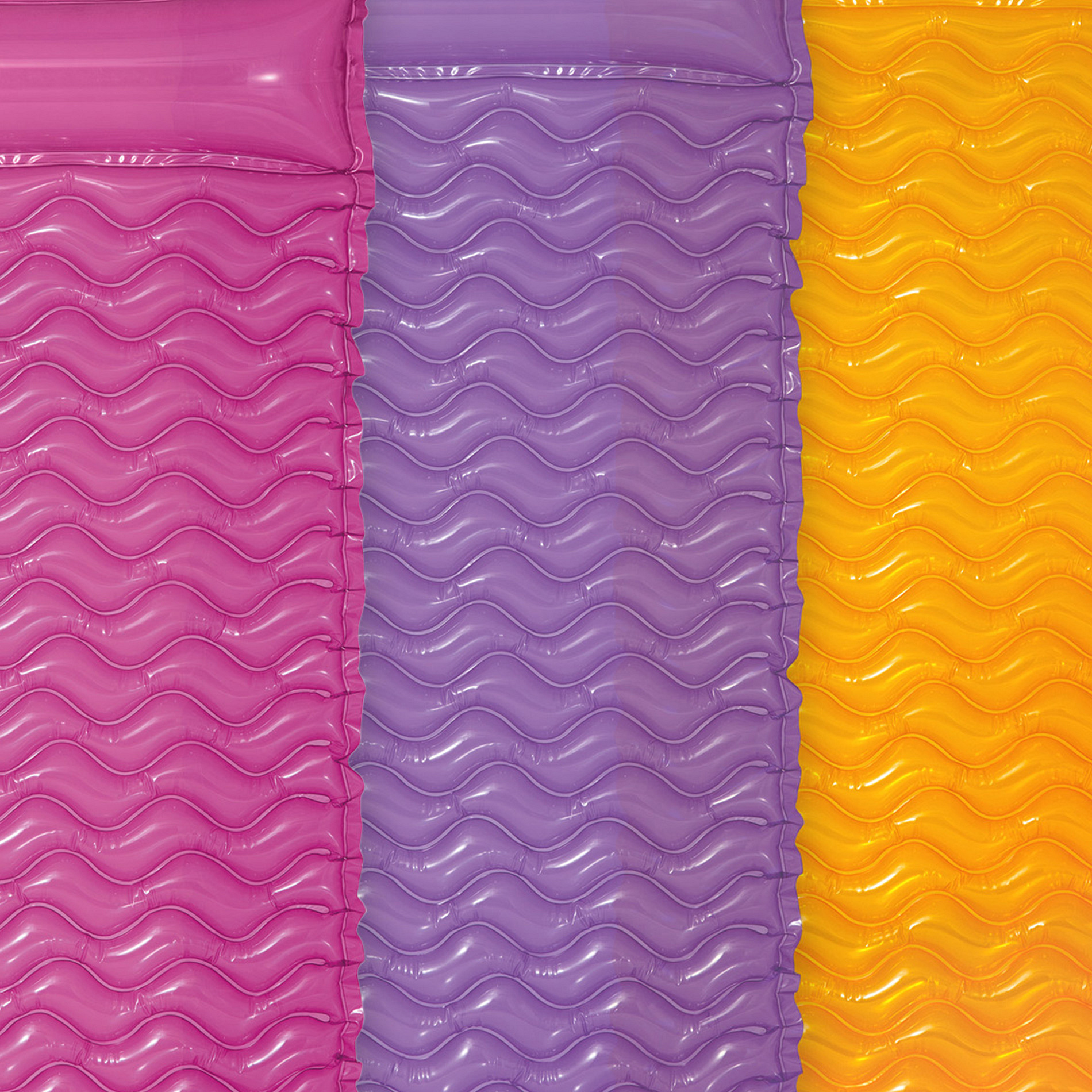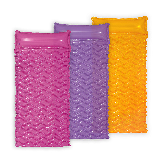 Nafukovací lehátko o rozměrech 229 x 86 cm, s motivem vln a integrovaným polštářem. 2 vzduchové komory, dvojité svařené rohy a vinyl o tloušťce 0,25 mm zajišťují pevnost a příjemný komfort při ležení. Vlnkovitý tvar je hlavním rysem tohoto modelu, díky kterému je snadné ji sbalit a dát do tašky - bez odfouknutí. Maximální nosnost je 100 kg.