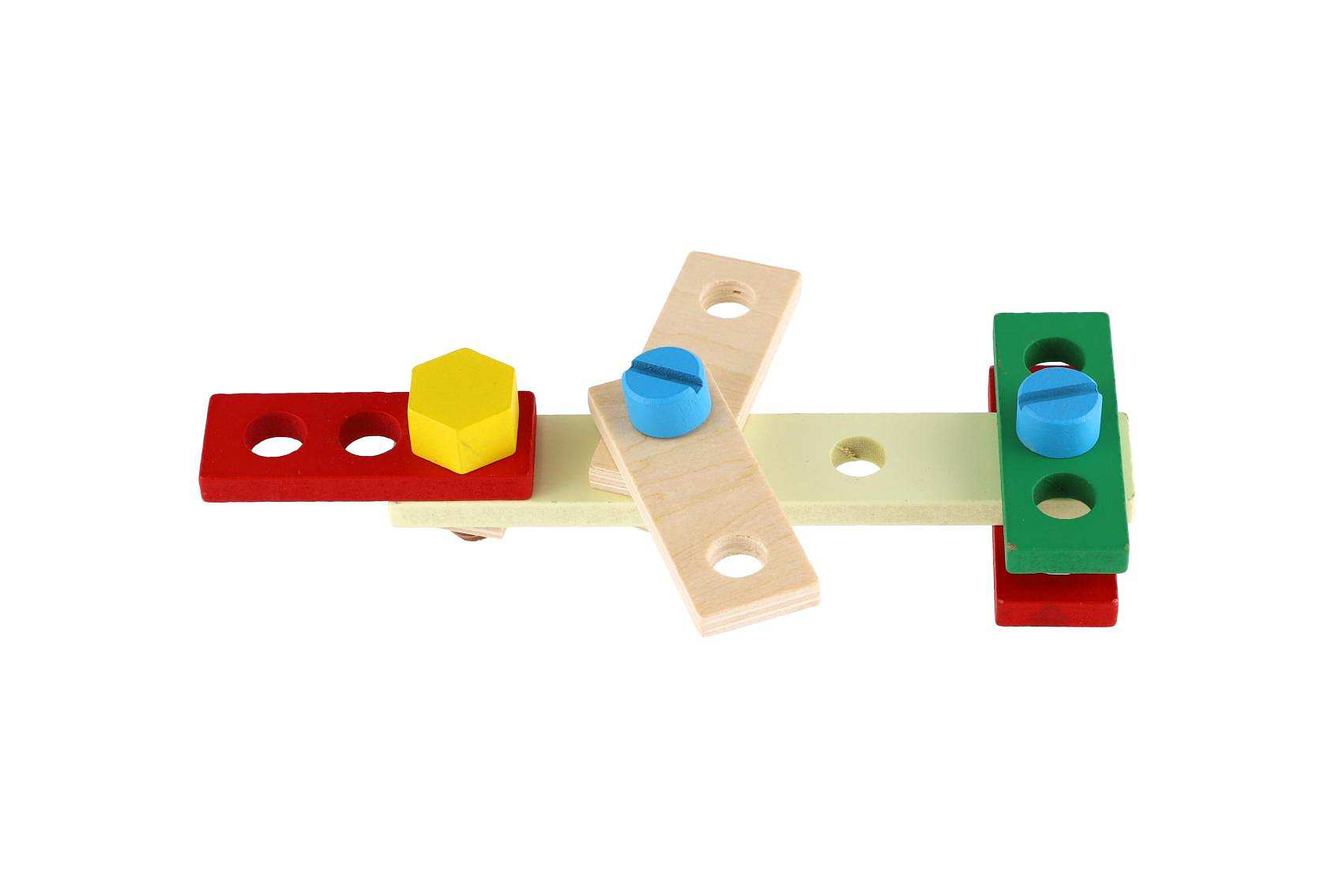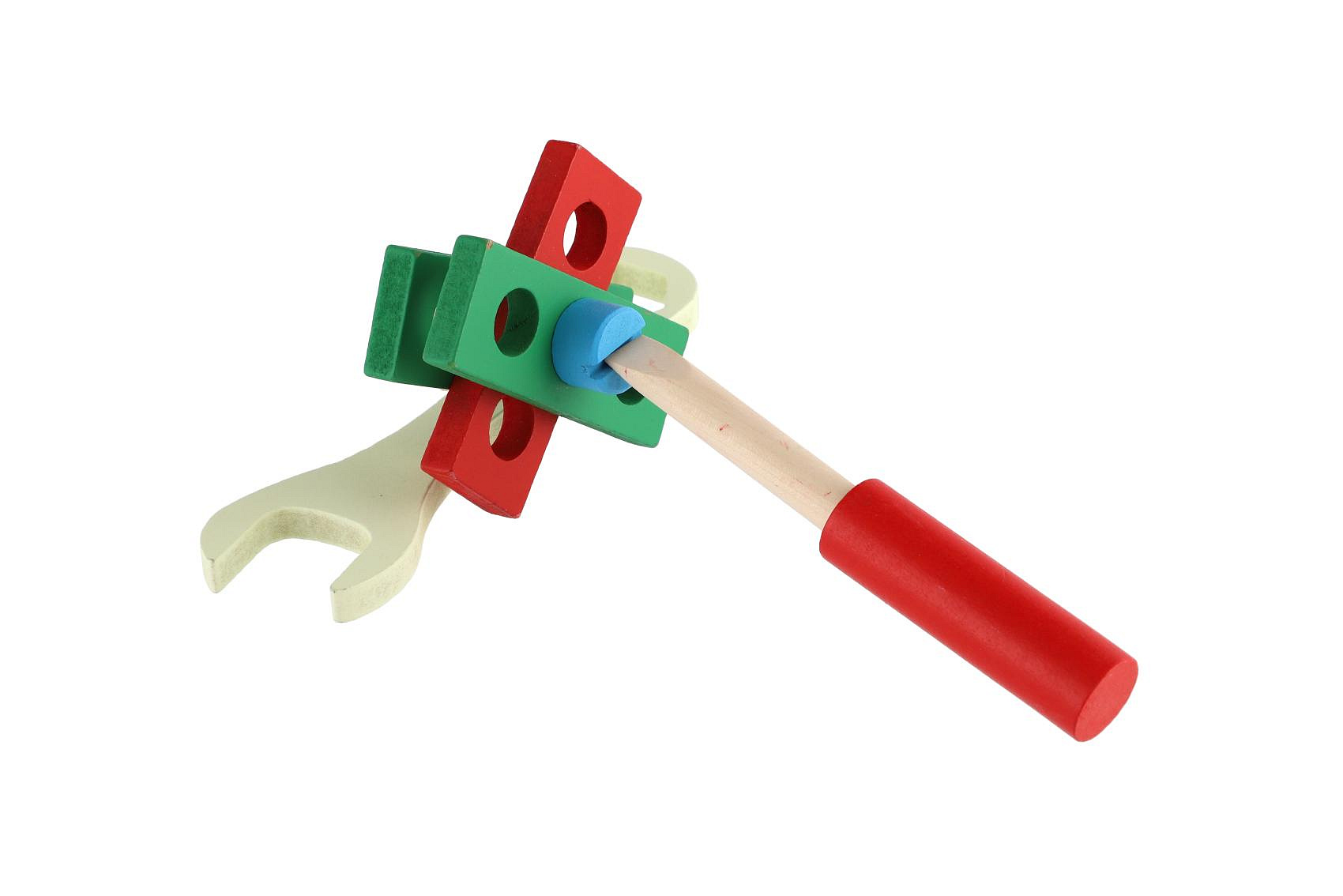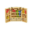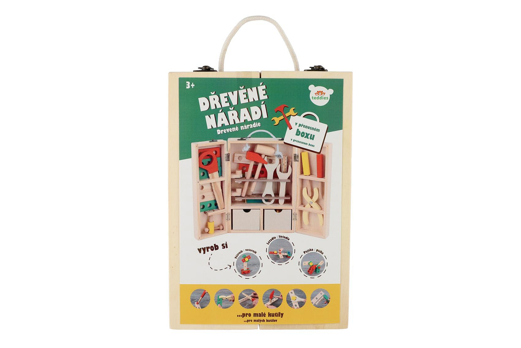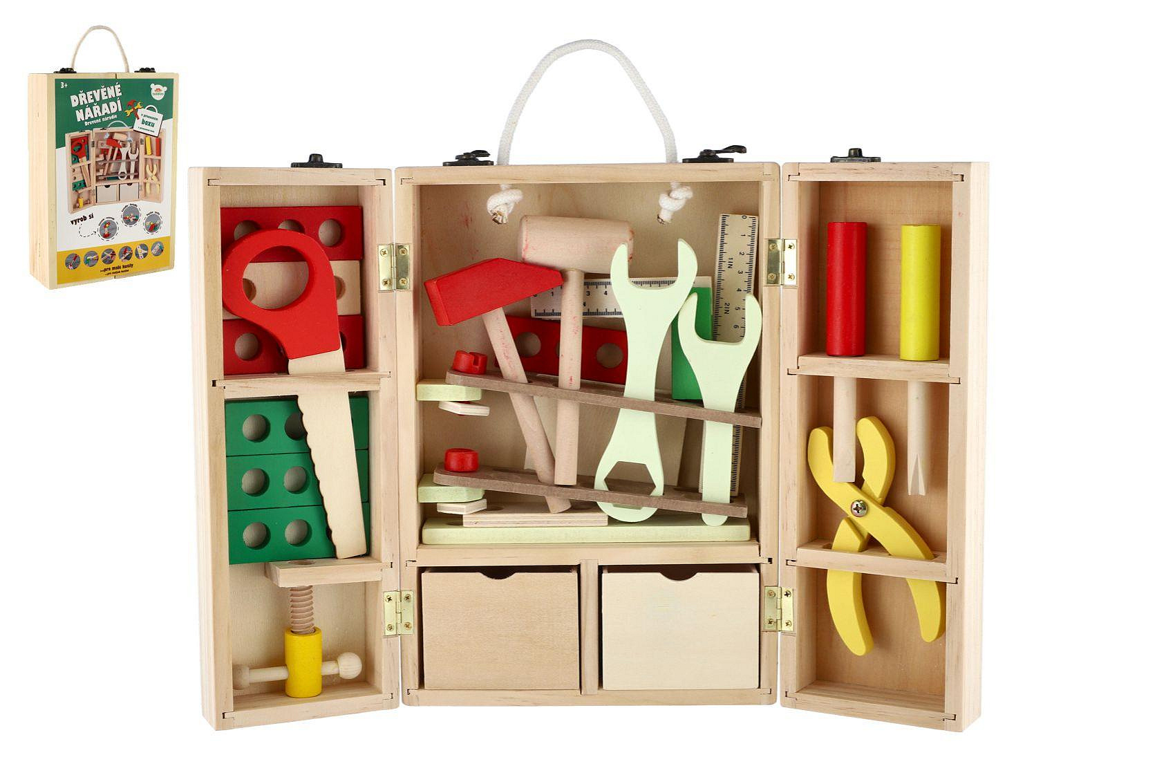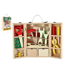 Dřevěný kufřík s nářadím obsahuje šroubováky, kladívka, klíče, matice, šrouby, úhelník, pravítko, pilu a spoustu dalšího. Hračka pomáhá rozvíjet technické chápání a jemnou motoriku rukou. Pro všechny malé kutily. Rozměry balení 21 x 30 x 8 cm Vhodné pro děti od 3 let.