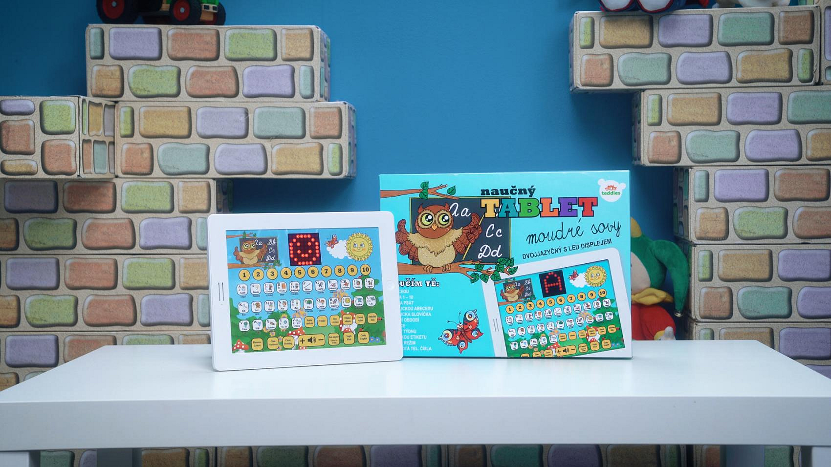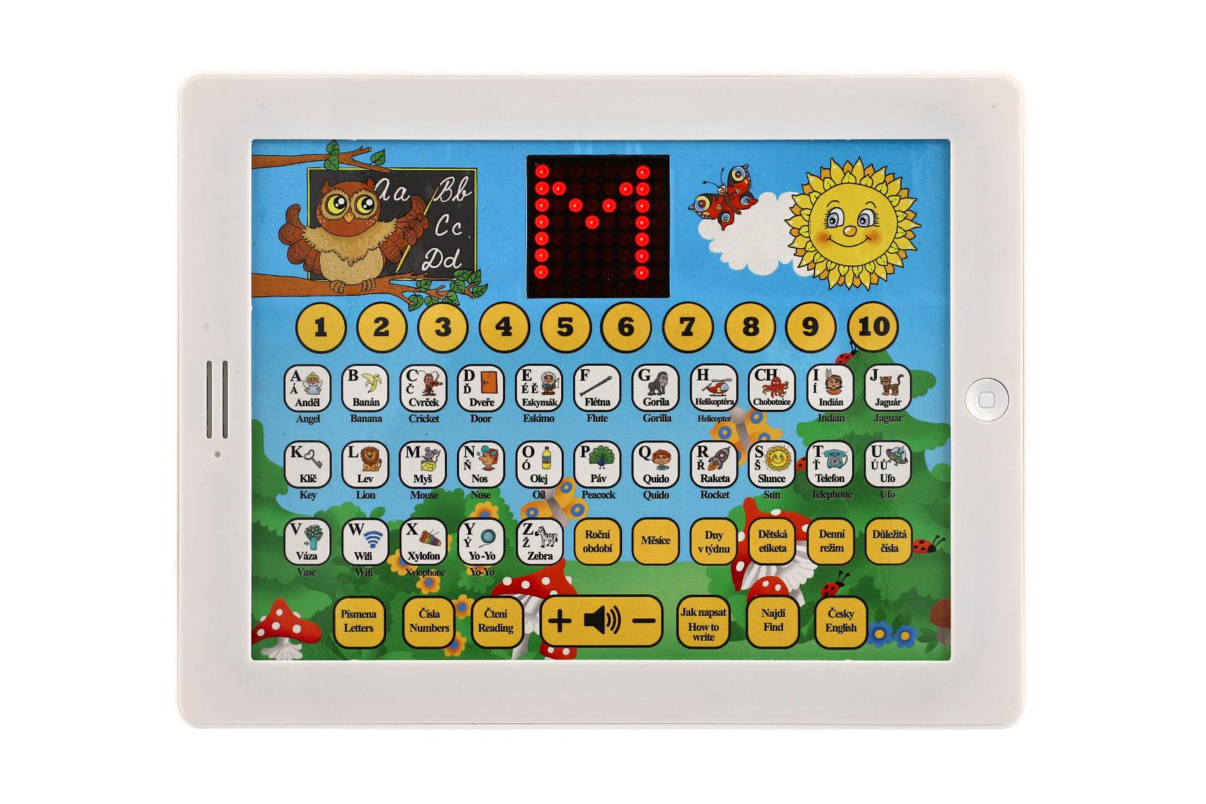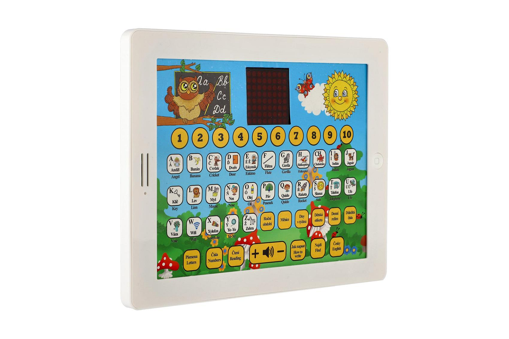 Naučný tablet moudré sovy dvojjazyčný CZ+AJ plast 24x19x2cm na baterie se zvukem v krabici 32x23x3cm