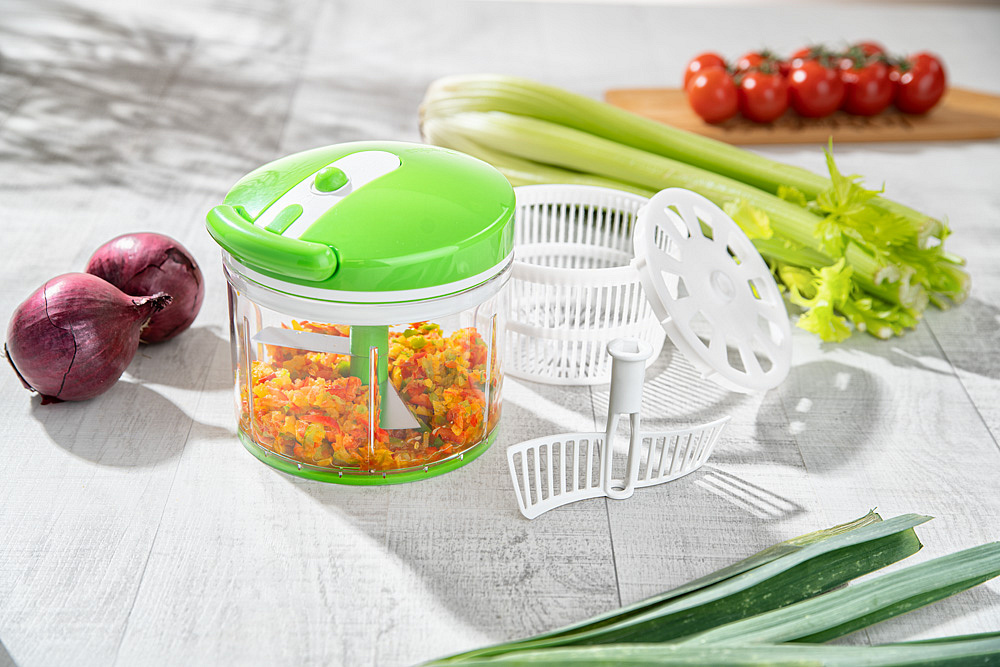 The handy Nicer Dicer Twist has different inserts for various preparations. This gives you an extra sharp blade insert with 3 blades for the best cutting results. With it you can chop, mix and puree. With the mixer insert you can easily whip cream and eggs and easily make the most delicious sauces and desserts. With the centrifuge insert, you can centrifuge small and delicate ingredients such as fresh herbs, lettuce, berries and much more.