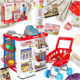 • Idealny zestaw z akcesoriami do odgrywania ról - kasa, czytnik, szeroki asortyment