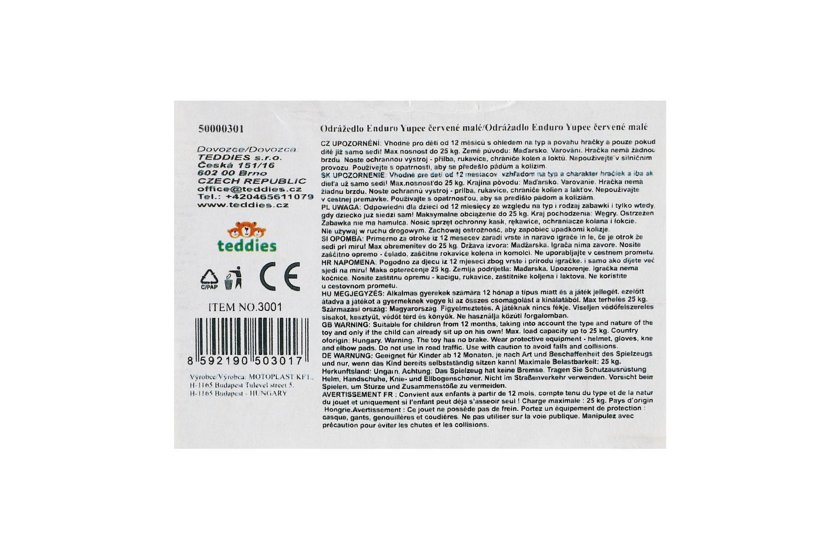 Odrážedlo Enduro Yupee červené malé plast výška sedadla 26cm nosnost do 25kg od 12 měsíců