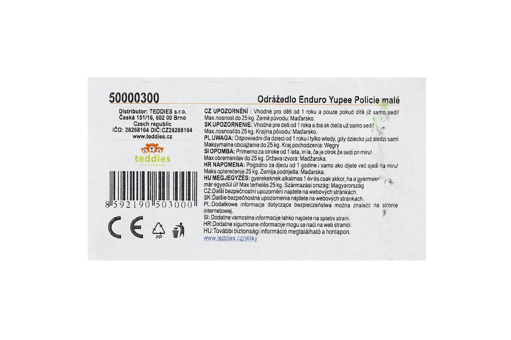 Odrážedlo Enduro Yupee Policie malé plast výška sedadla 26cm nosnost do 25kg 12m+