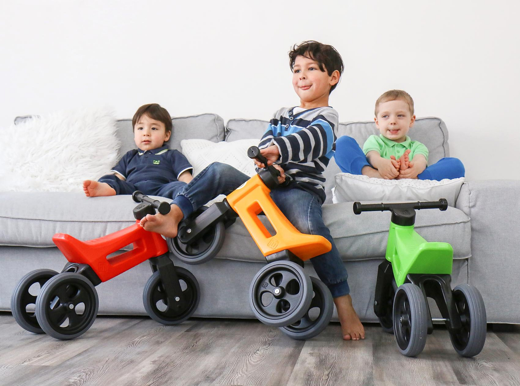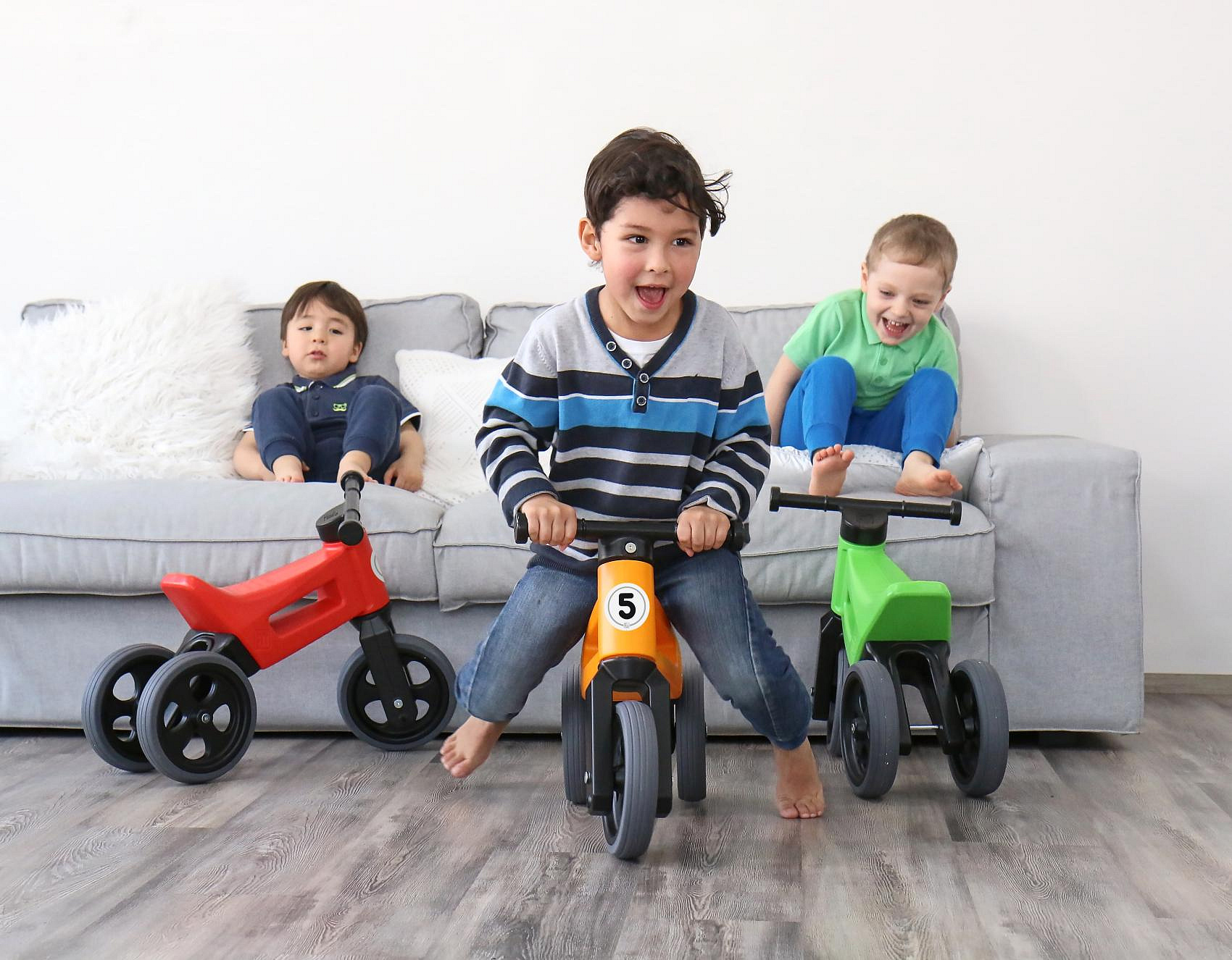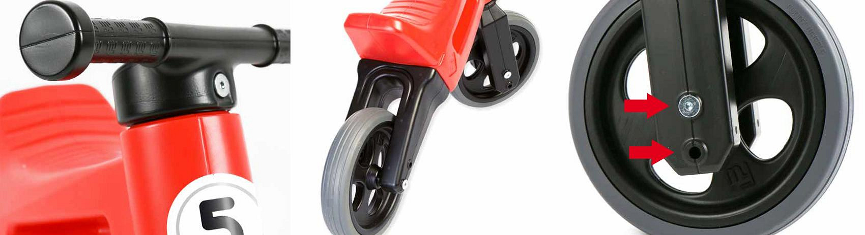 FUNNY WHEELS SPORT odrážedlo s pneumatikami, díky kterým má odrážedlo tichý provoz a kola se nekloužou. A jedééém! FUNNY WHEELS je originální české odrážedlo, které dokáže růst s vaším dítětem. Vzhledem k tomu, že můžete vyměnit dvě zadní kola za jedno a nastavit jeho výšku, nemusíte kupovat každý rok nové odstrkovadlo. FUNNY WHEELS vám vydrží, dokud nebudete kupovat první kolo. Hlavní výhody FUNNY WHEELS: 2v1 – během pár minut změníte tříkolové odrážedlo na dvoukolové 2 výškové polohy – nastavíte vpředu i vzadu (rozdíl 3 cm) Tiché pneumatiky, které nekloužou na výběr v 6 barvách – zelená, červená, modrá, růžová, oranžová, šedá cool design bezpečné i pro ty nejmenší z odolného a nezávadného plastu, se zahlazenými spoji omyvatelné vlažnou vodou a mýdlovými čisticími prostředky kompletně vyrobené v České republice FUNNY WHEELS roste stejně, jako váš prcek. Ten začne jezdit na malém tříkolovém odrážedle, až se vytáhne, jednoduše FUNNY WHEELS zvednete o 3 cm výš a jede se dál. Až přijde čas trénovat balanc, jednoduše vyměníte dvě zadní kolečka za jedno a dítko se může začít připravovat na jízdu na kole. Jak přesně to funguje, vidíte na videu. Odstrkovadlo je přitom stabilní (ve variantě se třemi koly). Vidlice má omezený rozsah otáčení a řídítka se tak nemohou přetočit. Rukojeti řídítek jsou na konci rozšířené, a tím chrání dětské ruce před poraněním. Odrážedlo je hračka, která baví snad každé dítě. S FUNNY WHEELS si užije radost z pohybu, zlepší si své motorické schopnosti a koordinaci, natrénuje pozornost, rovnováhu a třeba si i zazávodí! Vaše společné procházky budou delší, rychlejší a zábavnější. Technické parametry: doporučený věk: od 18 měsíců nosnost: 25 kg váha odrážedla: 2,1 kg výška sedla: 28/31 cm šířka řídítek: 30 cm rozteč zadních kol: 20 cm průměr kola:19 cm šířka pneumatiky: 4 cm Odrážedlo koupíte sestavené jako tříkolové. Součástí balení jsou dva imbusy a kratší osa na zadní kolo pro úpravu odrážedla na dvoukolové. Je možné zakoupit i náhradní díly – samostatná kola a osy.
