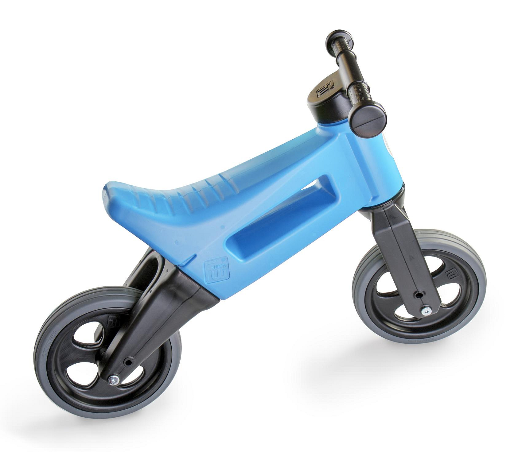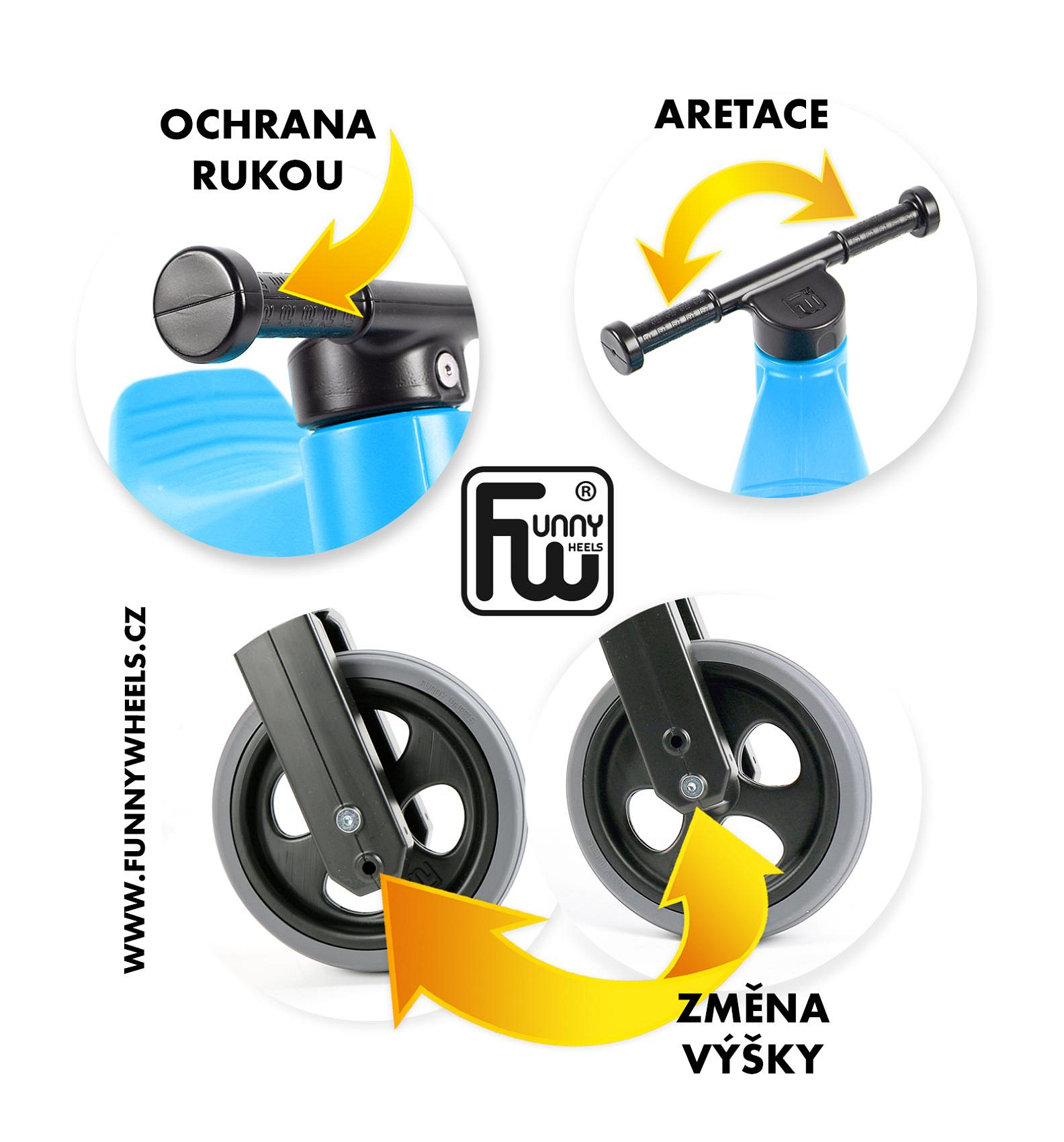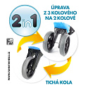 FUNNY WHEELS SPORT novinka s pneumatikami, díky kterým má odrážedlo tichý provoz a kola se nekloužou. A jedééém! FUNNY WHEELS je originální české odrážedlo, které dokáže růst s vaším dítětem. Vzhledem k tomu, že můžete vyměnit dvě zadní kola za jedno a nastavit jeho výšku, nemusíte kupovat každý rok nové odstrkovadlo. FUNNY WHEELS vám vydrží, dokud nebudete kupovat první kolo. Hlavní výhody FUNNY WHEELS: 2v1 – během pár minut změníte tříkolové odrážedlo na dvoukolové 2 výškové polohy – nastavíte vpředu i vzadu (rozdíl 3 cm) Tiché pneumatiky, které nekloužou na výběr v 6 barvách – zelená, červená, modrá, růžová, oranžová, šedá cool design bezpečné i pro ty nejmenší z odolného a nezávadného plastu, se zahlazenými spoji omyvatelné vlažnou vodou a mýdlovými čisticími prostředky kompletně vyrobené v České republice FUNNY WHEELS roste stejně, jako váš prcek. Ten začne jezdit na malém tříkolovém odrážedle, až se vytáhne, jednoduše FUNNY WHEELS zvednete o 3 cm výš a jede se dál. Až přijde čas trénovat balanc, jednoduše vyměníte dvě zadní kolečka za jedno a dítko se může začít připravovat na jízdu na kole. Jak přesně to funguje, vidíte na videu. Odstrkovadlo je přitom stabilní (ve variantě se třemi koly). Vidlice má omezený rozsah otáčení a řídítka se tak nemohou přetočit. Rukojeti řídítek jsou na konci rozšířené, a tím chrání dětské ruce před poraněním. Odrážedlo je hračka, která baví snad každé dítě. S FUNNY WHEELS si užije radost z pohybu, zlepší si své motorické schopnosti a koordinaci, natrénuje pozornost, rovnováhu a třeba si i zazávodí! Vaše společné procházky budou delší, rychlejší a zábavnější. Technické parametry: doporučený věk: od 18 měsíců nosnost: 25 kg váha odrážedla: 2,10 kg výška sedla: 28/31 cm šířka řídítek: 30 cm rozteč zadních kol: 20 cm průměr kola:19 cm šířka pneumatiky: 4 cm Odrážedlo koupíte sestavené jako tříkolové. Součástí balení jsou dva imbusy a kratší osa na zadní kolo pro úpravu odrážedla na dvoukolové. Je možné zakoupit i náhradní díly – samostatná kola a osy.