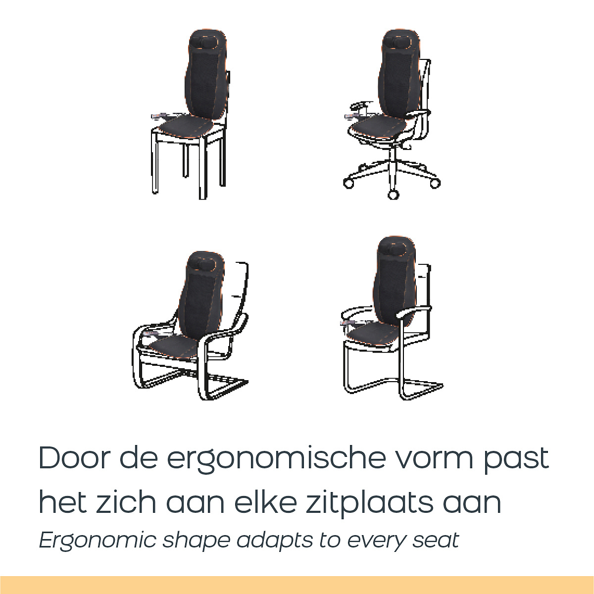 This massage cushion fits any chair and has different massage zones that are specially designed to massage the neck, spine, back and hips. It has a positive effect on tense muscles, making them relax. The additional heating function increases the feeling of comfort and relaxation. The mat has an ergonomic shape and is made of flexible materials, allowing it to adapt to any armchair. After a long day at a desk, a long drive in the car or a hectic day, with the Massage Seat cushion from Orange Care you can completely relax yourself.