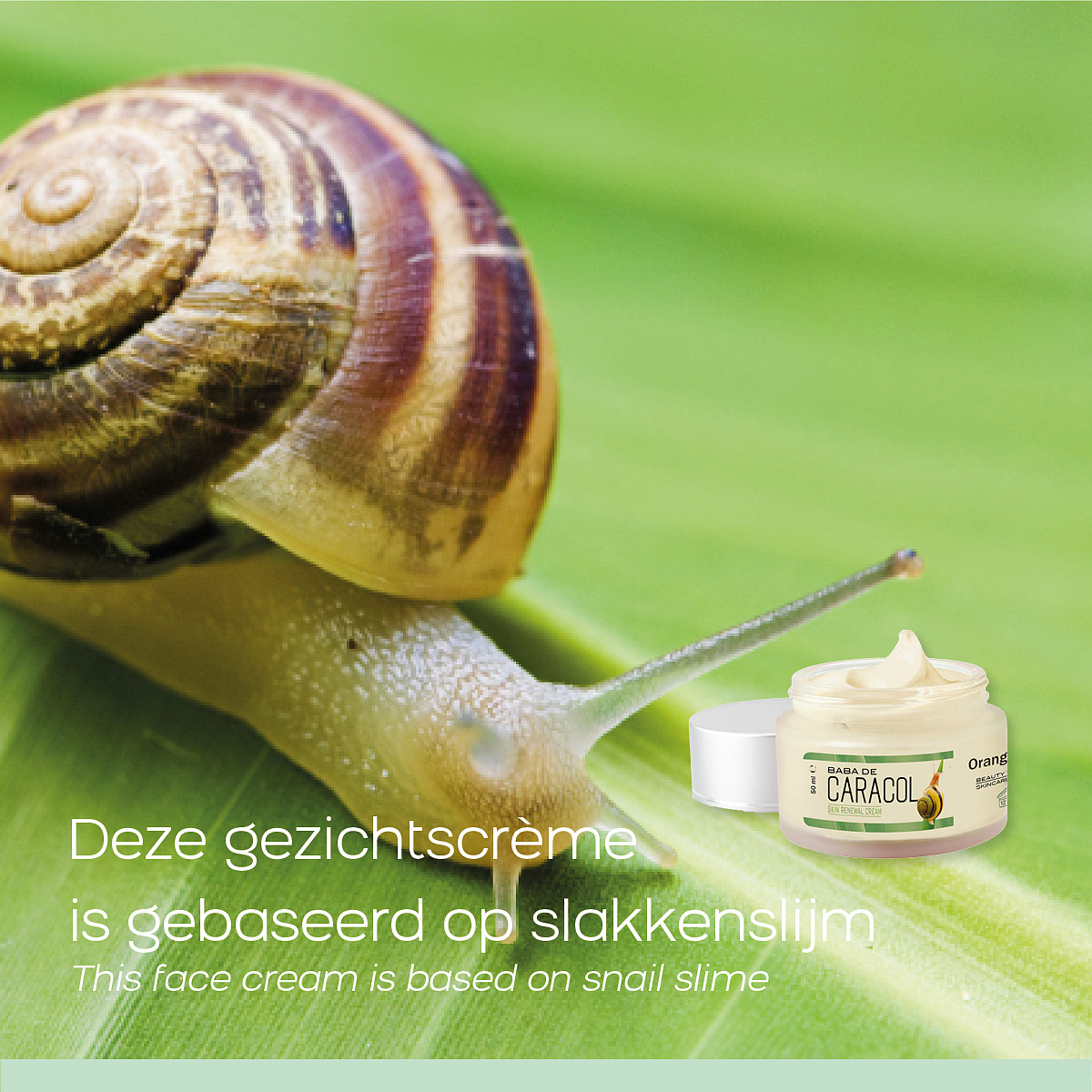 Then the Orange Care Baba de Caracol face cream and hand cream are the skin care products you are looking for. These creams are based on snail slime. Snails are able to repair and renew their own skin with their mucus. This beautiful process is also applied to your own skin by using this snail slime cream.