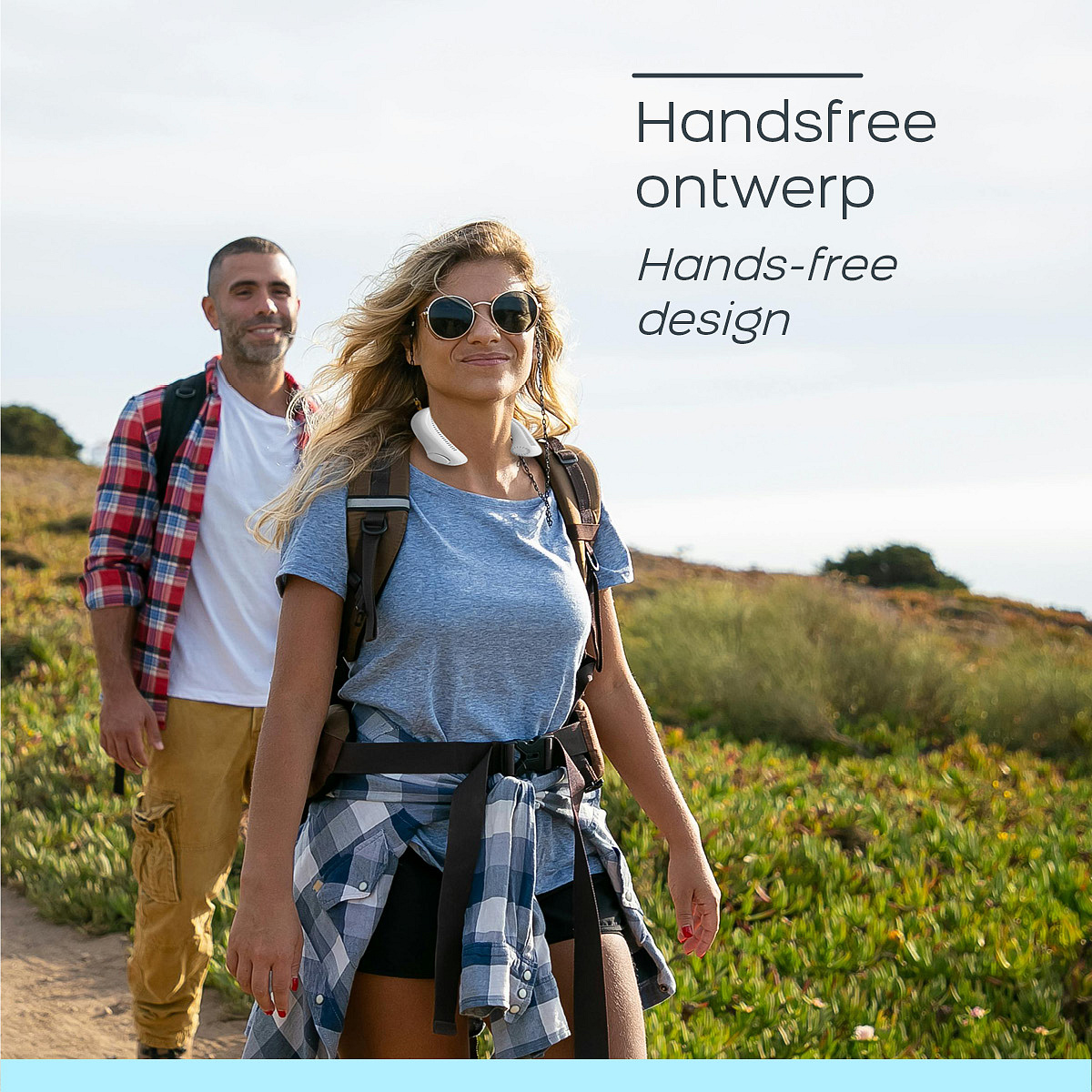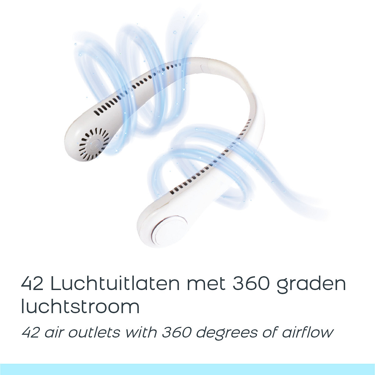 Let's start with the innovative design with 42 strategically placed air outlets around the neck. Say goodbye to discomfort and hello to continuous coolness as this device delivers a refreshing breeze across your entire facial area. Thanks to the hands-free design, you can wear the cooler around your neck. This allows you to keep your hands free while enjoying the cooling sensation. This makes the neck fan perfect for different activities.