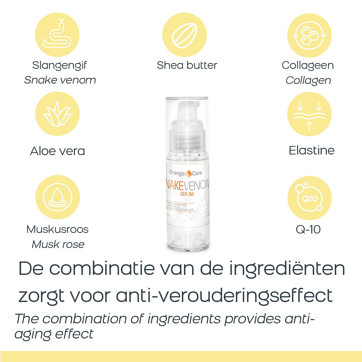 Nyní již nepotřebujete injekční jehly k dosažení podobného výsledku! Hadí jedové sérum je denní krém proti stárnutí se speciálními syntetickými složkami, které jsou podobné hadímu jedu.Když tento sérum aplikujete na obličej, syntetické složky zajistí, že svalové kontrakce ve vašem obličeji jsou potlačeny.