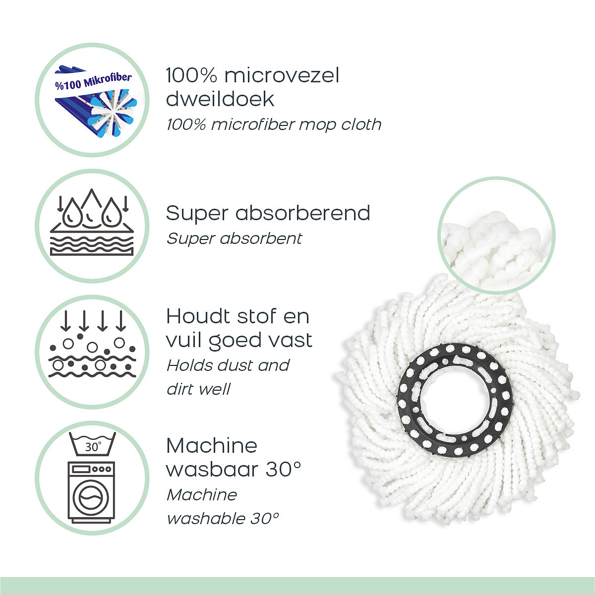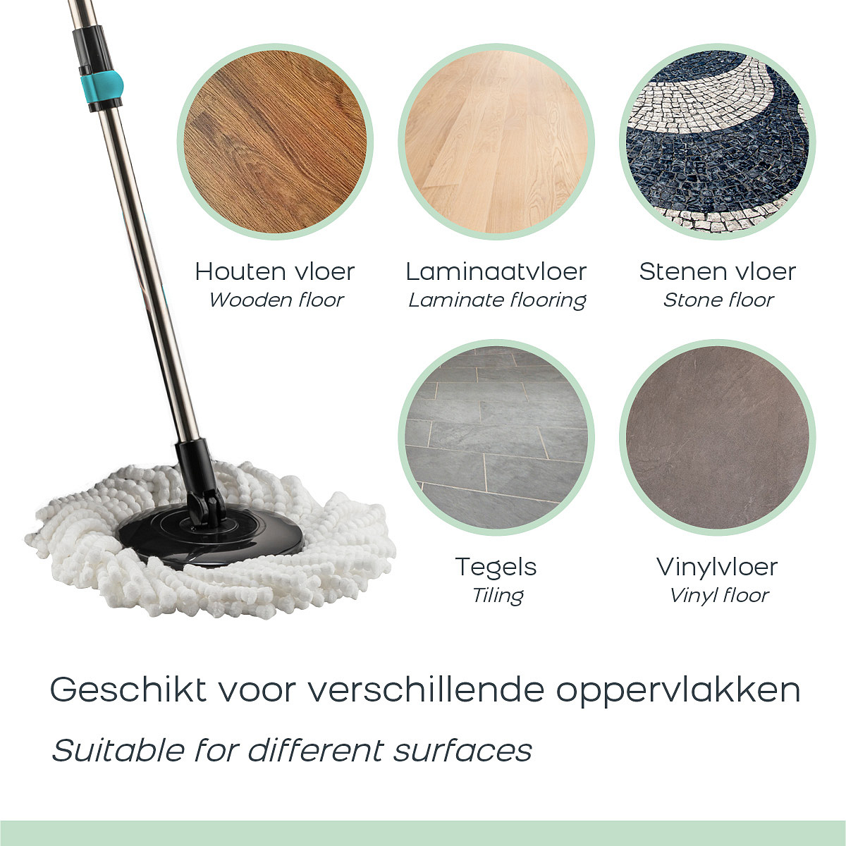 The special mop is made of microfibers and removes up to 99% of the bacteria on the floor. The fringes easily get everywhere and are able to remove even the most stubborn dirt. In addition, the mop pad can also be washed in the washing machine, so you can use it again and again. In addition, the Spin Mop is incredibly maneuverable. This allows you to reach tight corners, under furniture and around obstacles effortlessly. The 360-degree swivel head allows for maximum flexibility, allowing you to navigate around your home with ease.