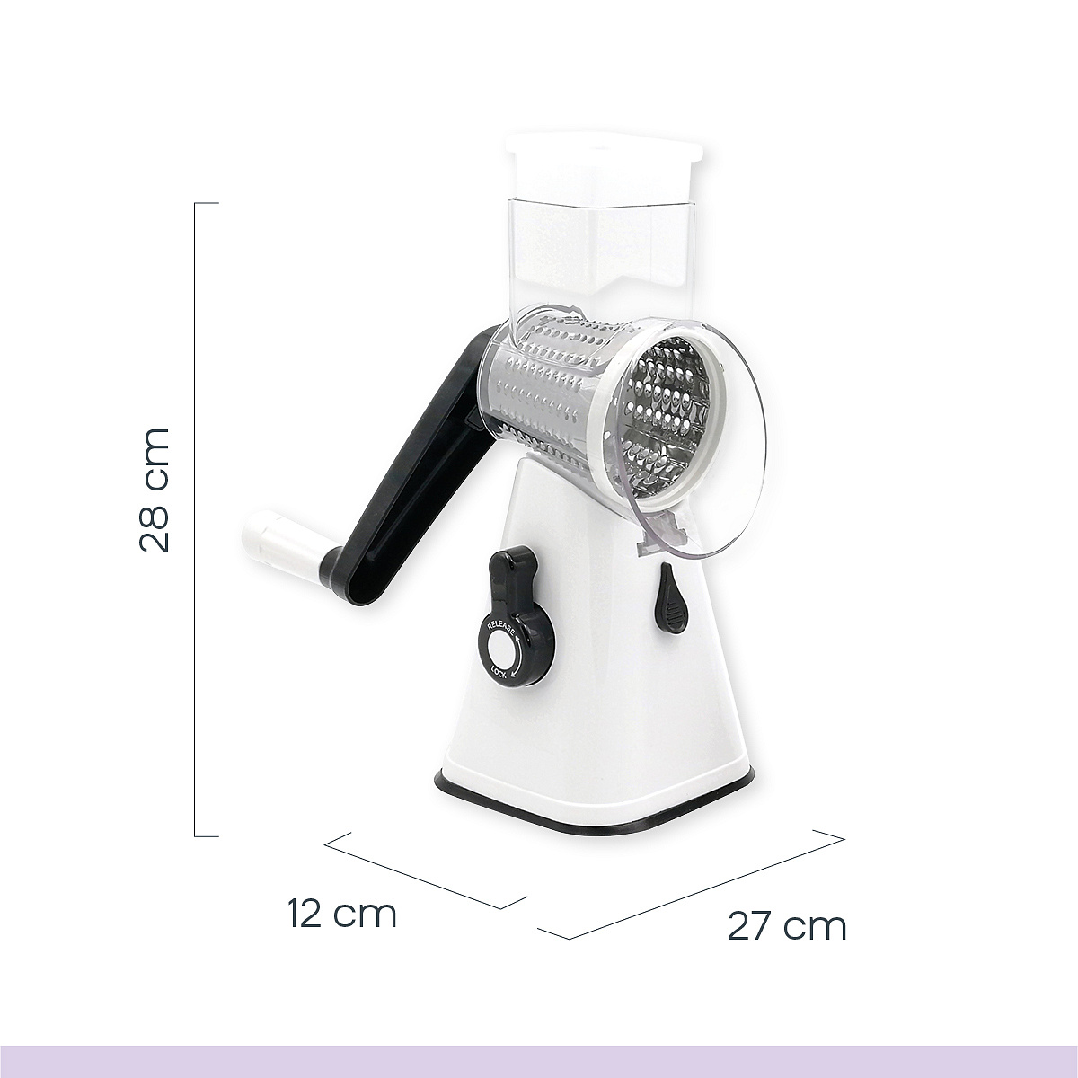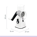 The vegetable cutter has 3 cutting options thanks to the different attachments. You use the cutting drum to cut thin slices of, for example, cucumber, zucchini and potatoes. The fine grater attachment can be used to finely grate cheese, nuts, chocolate and even biscuits. The coarse grater drum is ideal for shredding fruit and vegetables such as cabbage, potatoes and carrots.