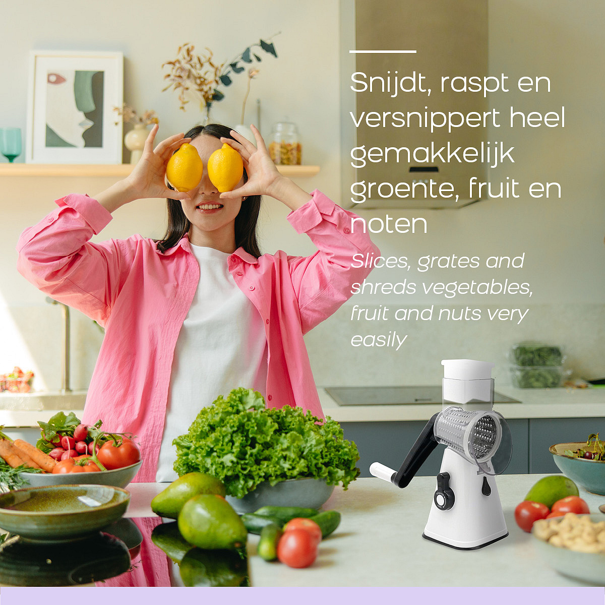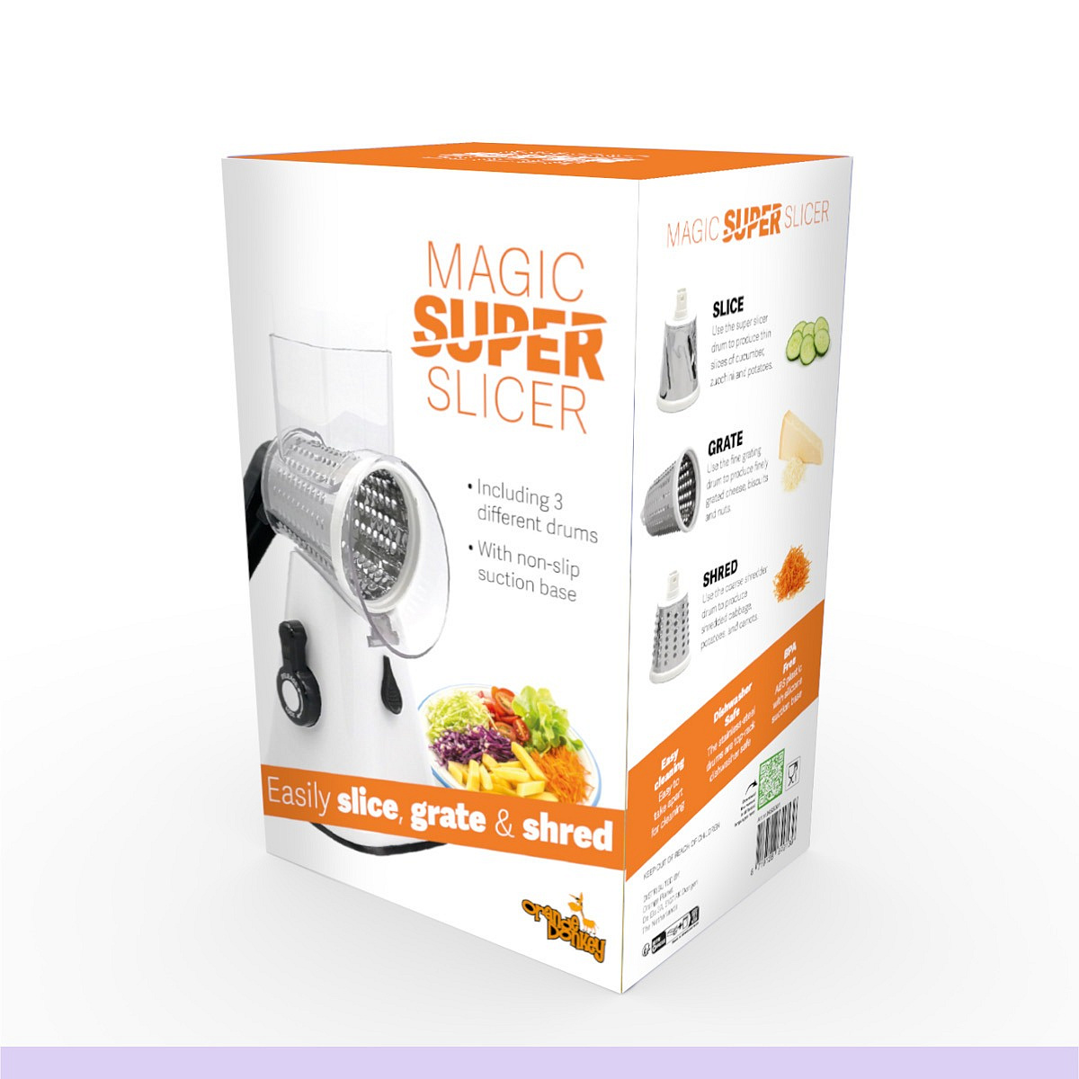 Do you always spend a long time in the kitchen cutting fruit and vegetables and could you use a kitchen aid while cooking? Then look no further, because with the 3-in-1 Magic Super Slicer from Orange Donkey you have the perfect tool at hand. With this compact mandolin you can easily cut, grate and shred vegetables, fruit and even nuts.