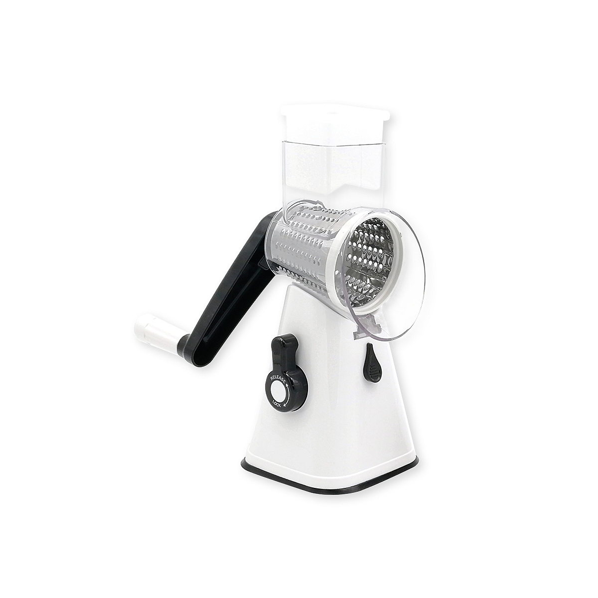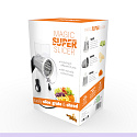 The vegetable cutter has 3 cutting options thanks to the different attachments. You use the cutting drum to cut thin slices of, for example, cucumber, zucchini and potatoes. The fine grater attachment can be used to finely grate cheese, nuts, chocolate and even biscuits. The coarse grater drum is ideal for shredding fruit and vegetables such as cabbage, potatoes and carrots.
