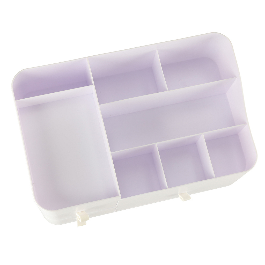 Na górnej części organizera znajduje się siedem przegródek o różnych rozmiarach, które idealnie nadają się do segregowania kosmetyków codziennego użytku, takich jak pędzle, szminki, tusze do rzęs czy flakony perfum. Dzięki temu każdy produkt ma swoje miejsce, co ułatwia jego szybkie znalezienie i oszczędza czas podczas porannej rutyny.
