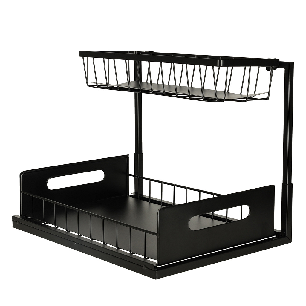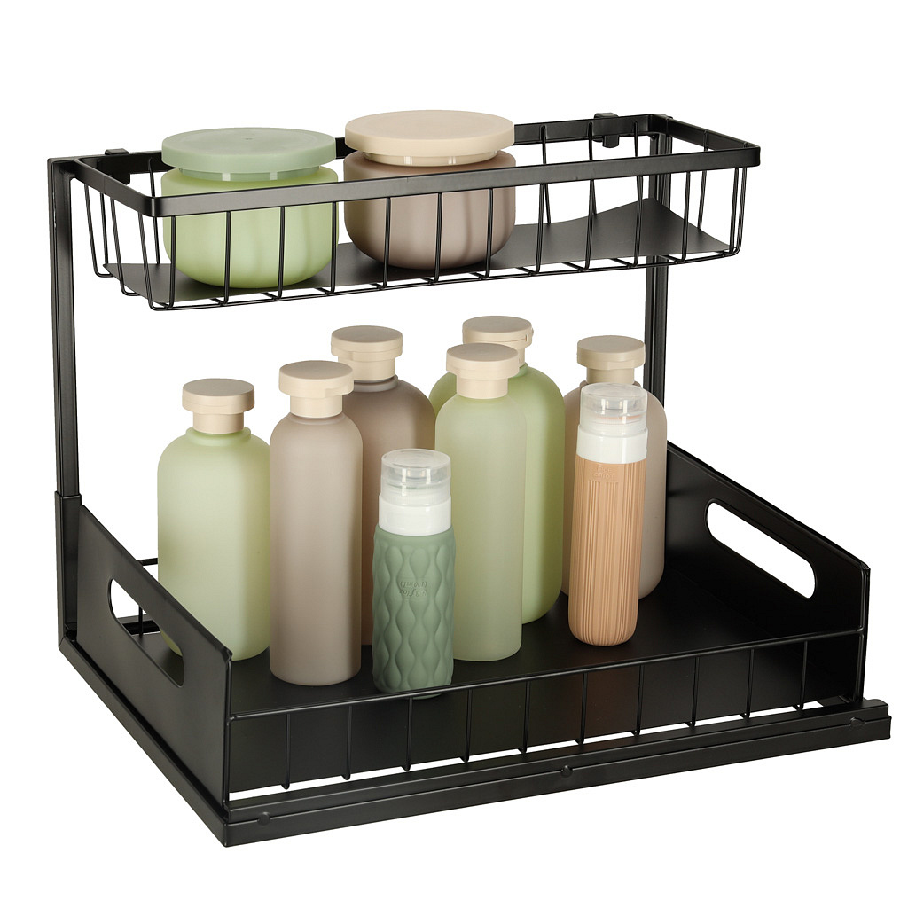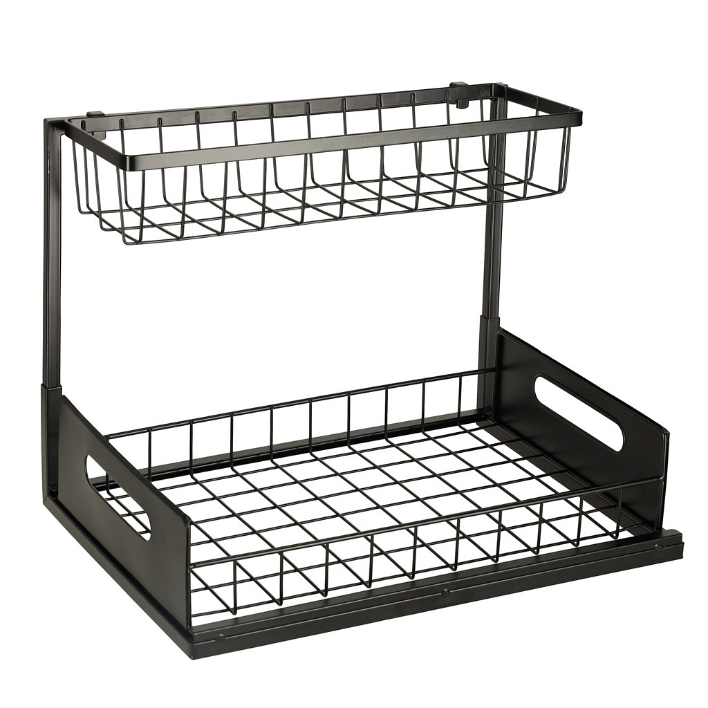 Spodní police se vysouvá, což umožňuje pohodlné dosahování na věci umístěné dále. Organizer pasuje do většiny kuchyňských skříněk a byl navržen tak, aby se vešel pod standardní dřez, aniž by překážel v provozu instalace vodovodu.