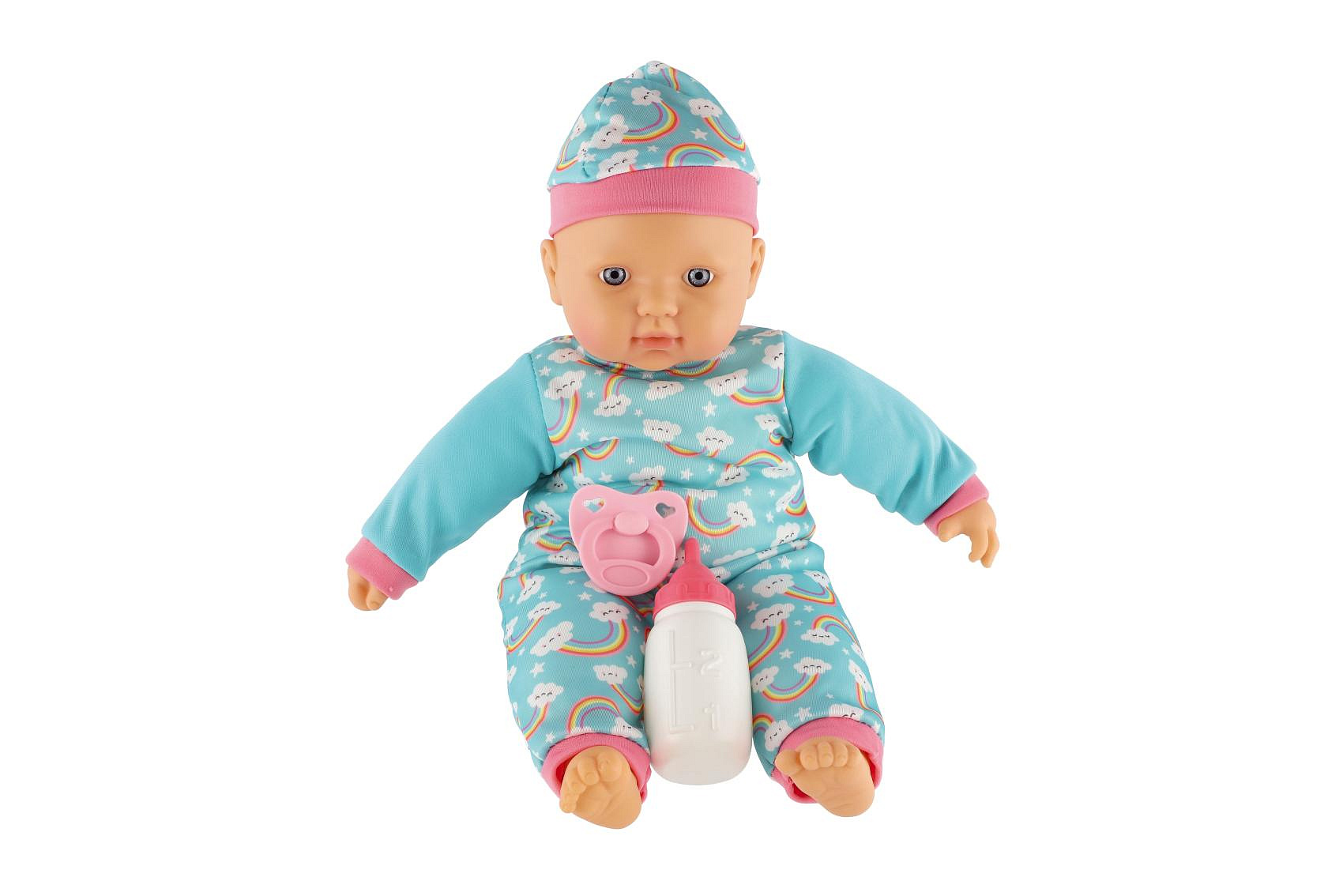 Roztomilá panenka s měkým tělíčkem v krásném oblečku s duhami. Toto miminko udělá jistě radost každé holčičce a stane se tak její nepostradatelnou součástí. Součástí balení je i lahvička a dudlík, které určitě každá maminka pro své miminko nutně potřebuje. Velikost panenky: 40 cm Rozměr balení: 41 x 19 x 12,5 cm