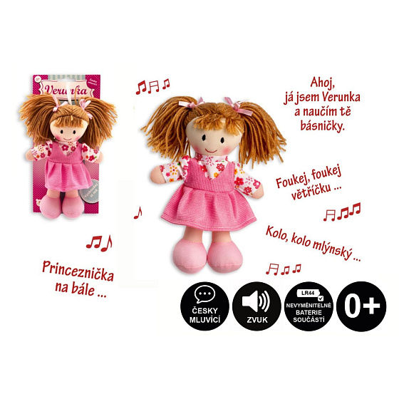 Hadrová panenka Verunka po zmáčknutí bříška povídá: "Ahoj, já jsem Verunka a naučím tě básničky" a říká básničky: "Princeznička na bále..., Foukej, foukej větříčku..., Kolo, kolo mlýnský..." Rozměr: 20 cm Vhodná pro děti od 0 let Výrobek obsahuje nevyměnitelné baterie.